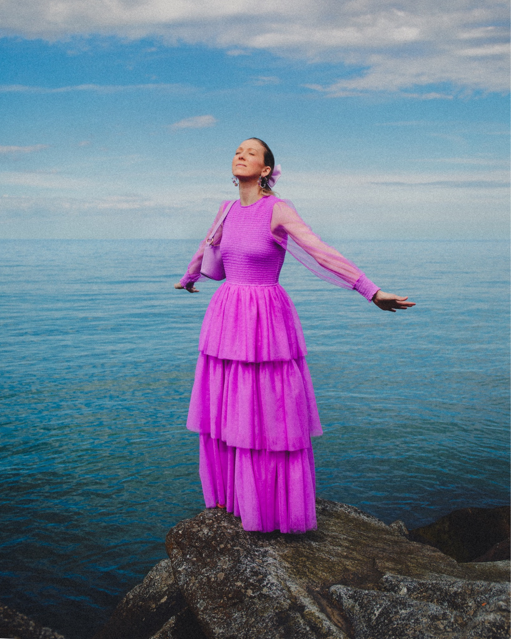 – The glittery purple bag ties everything together and gives it a whimsical vibe.