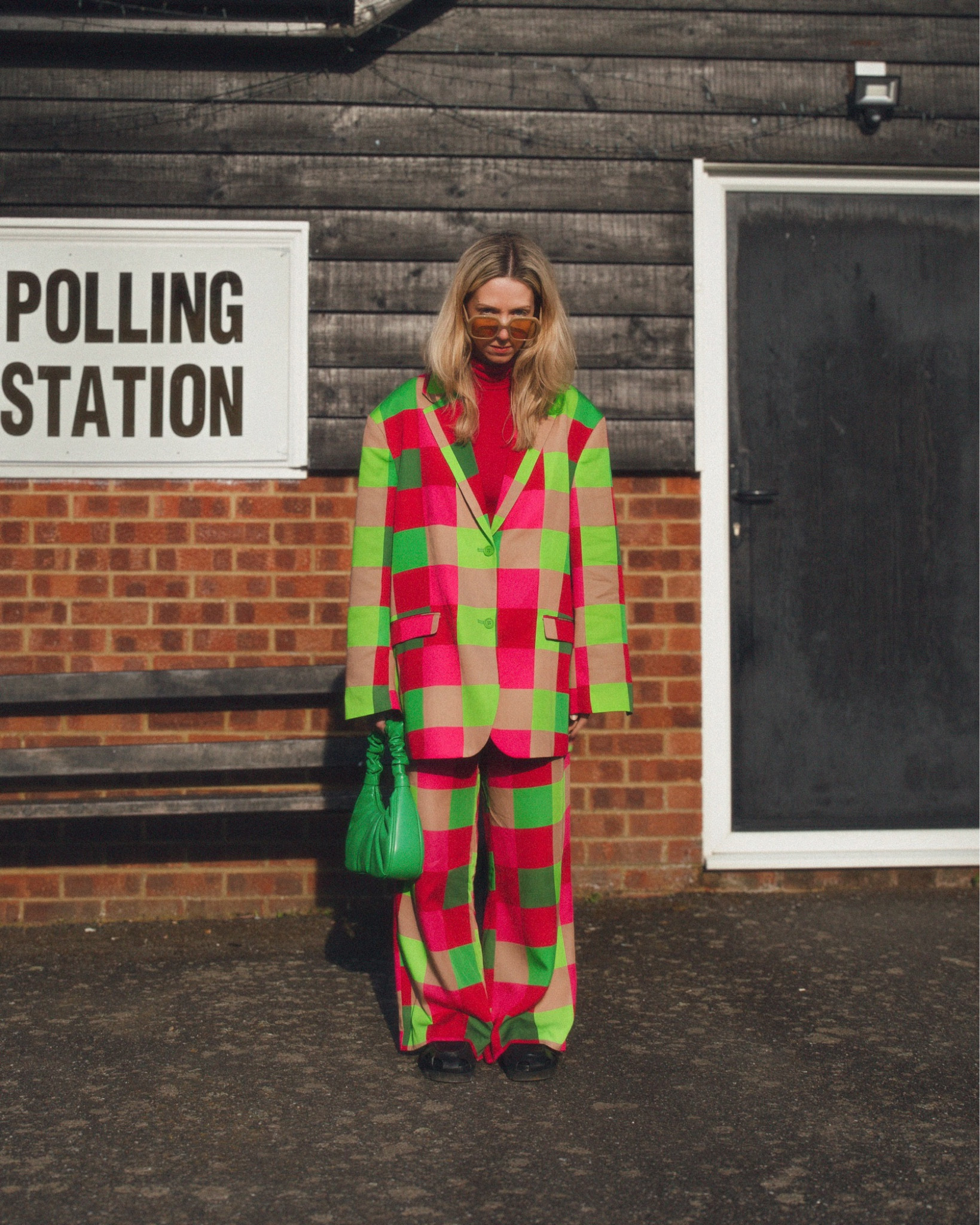 – Pairing it with the green bag is a nice pop of coordination that ties the whole look together.