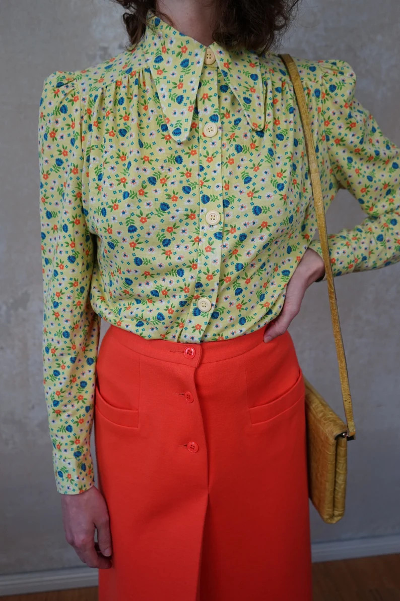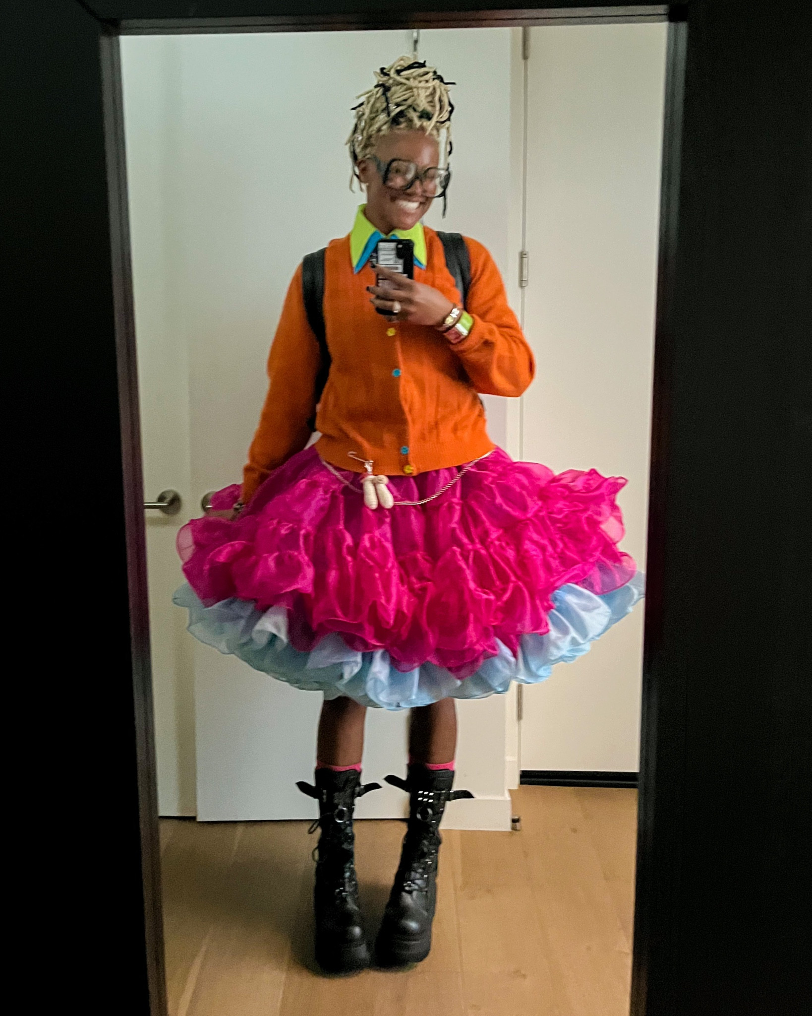 – The orange sweater paired with that vibrant skirt feels playful and creative.