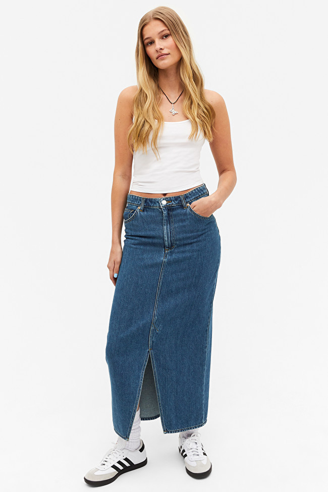 – The denim skirt with the front slit adds a casual touch that balances the playful accessories.