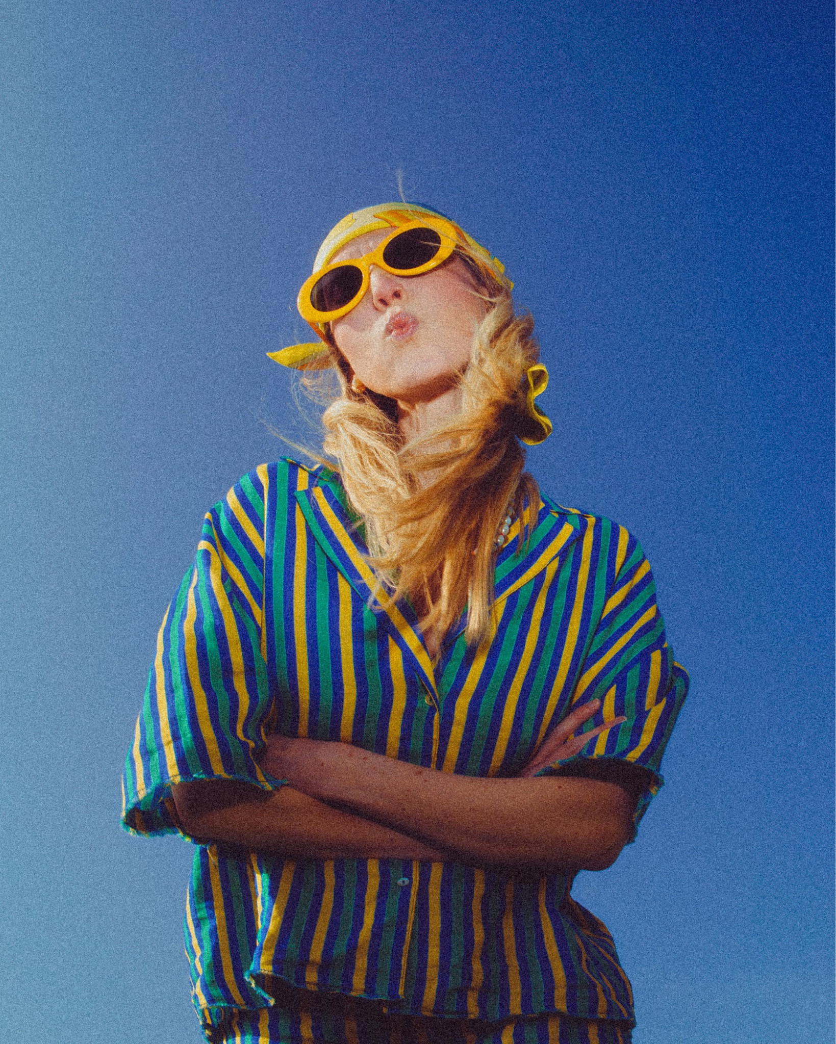 – Those yellow sunglasses and bandana add a playful, sunny vibe.