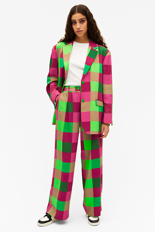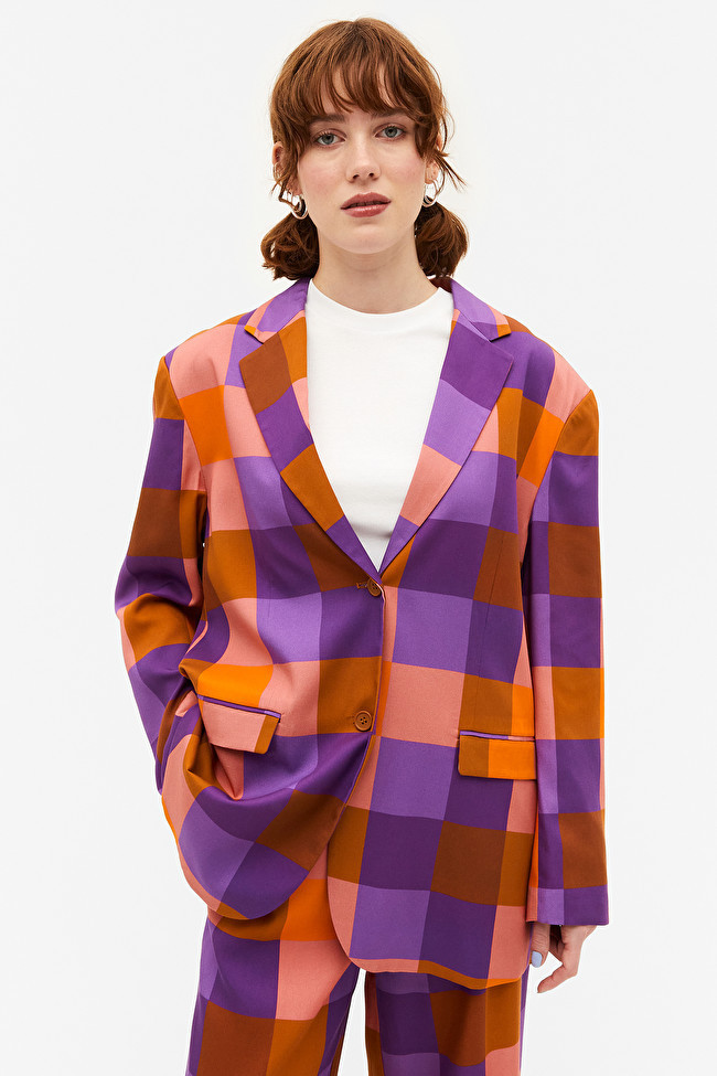 – I love the bold mix of colors with the lavender blazer and striped shorts; it feels fresh and fun.