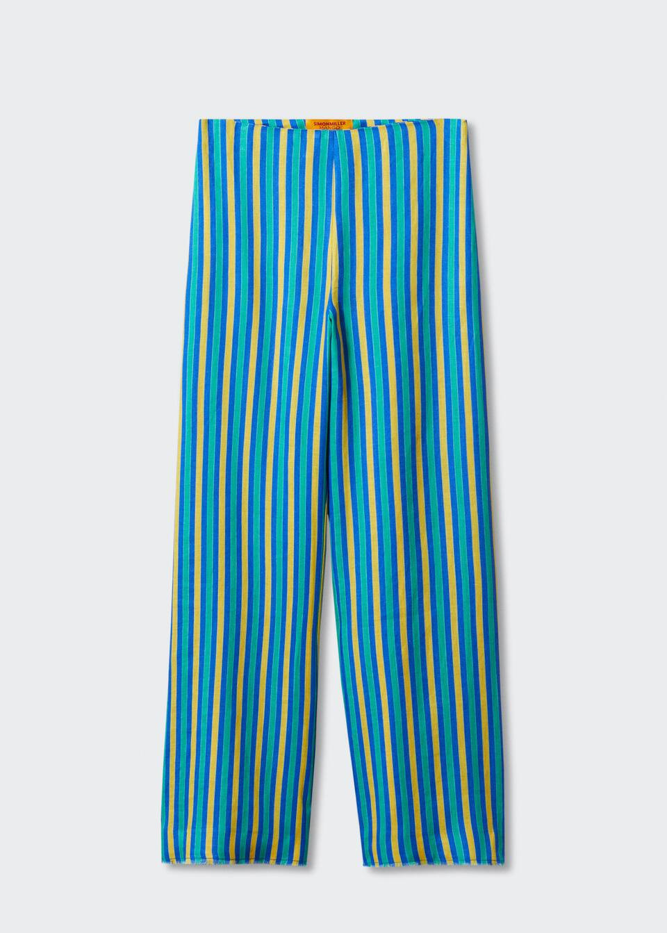 – I love the playful mix of bold stripes with the bright red accents; they make the outfit pop.