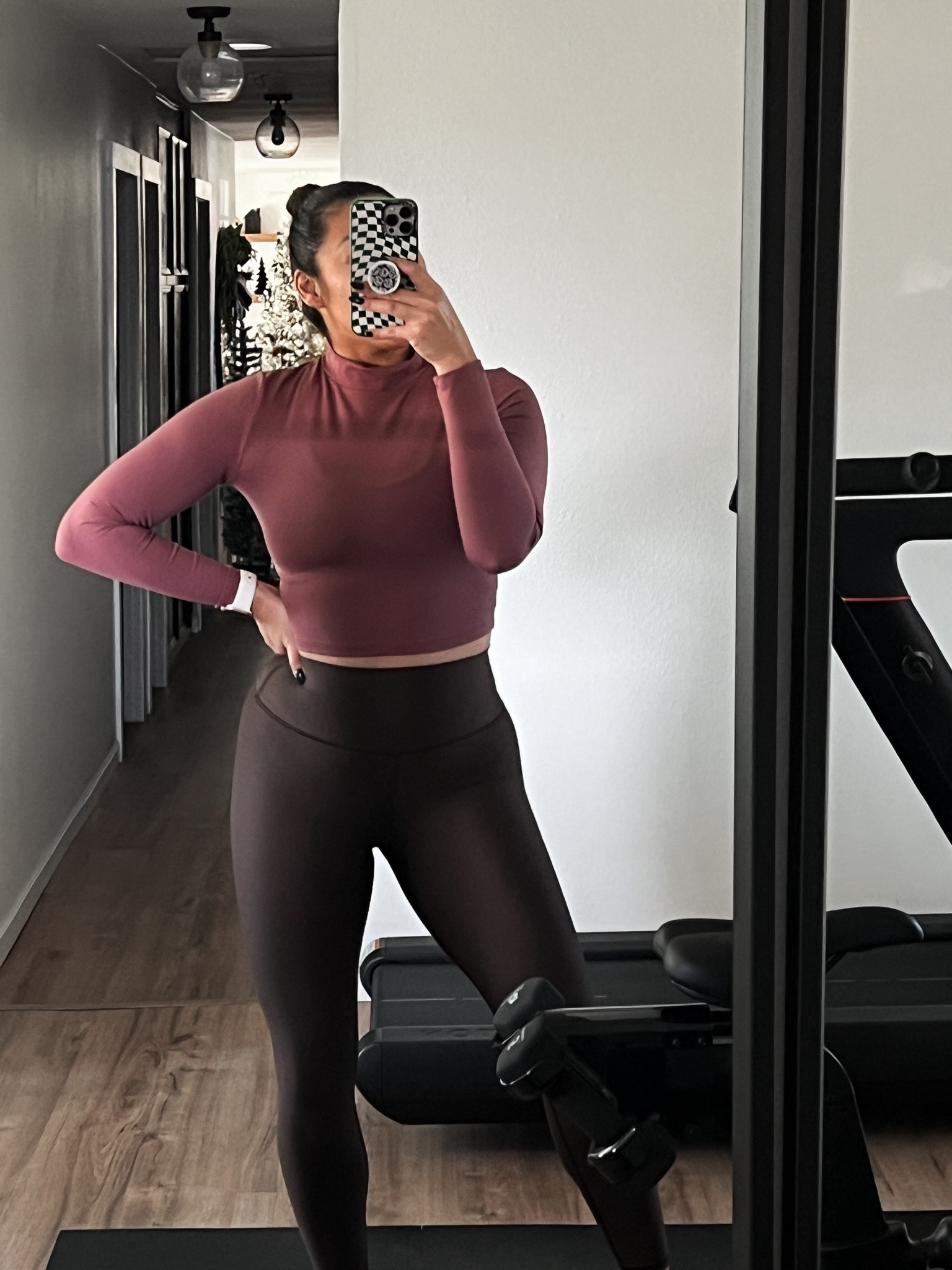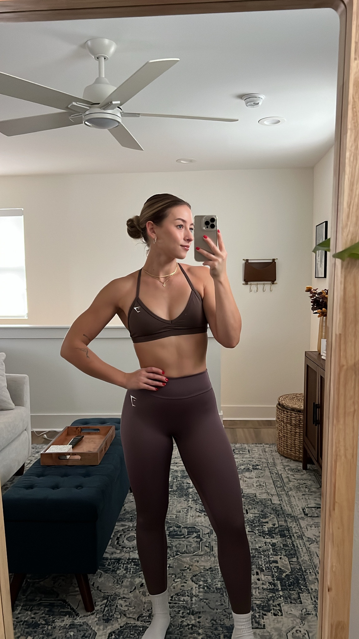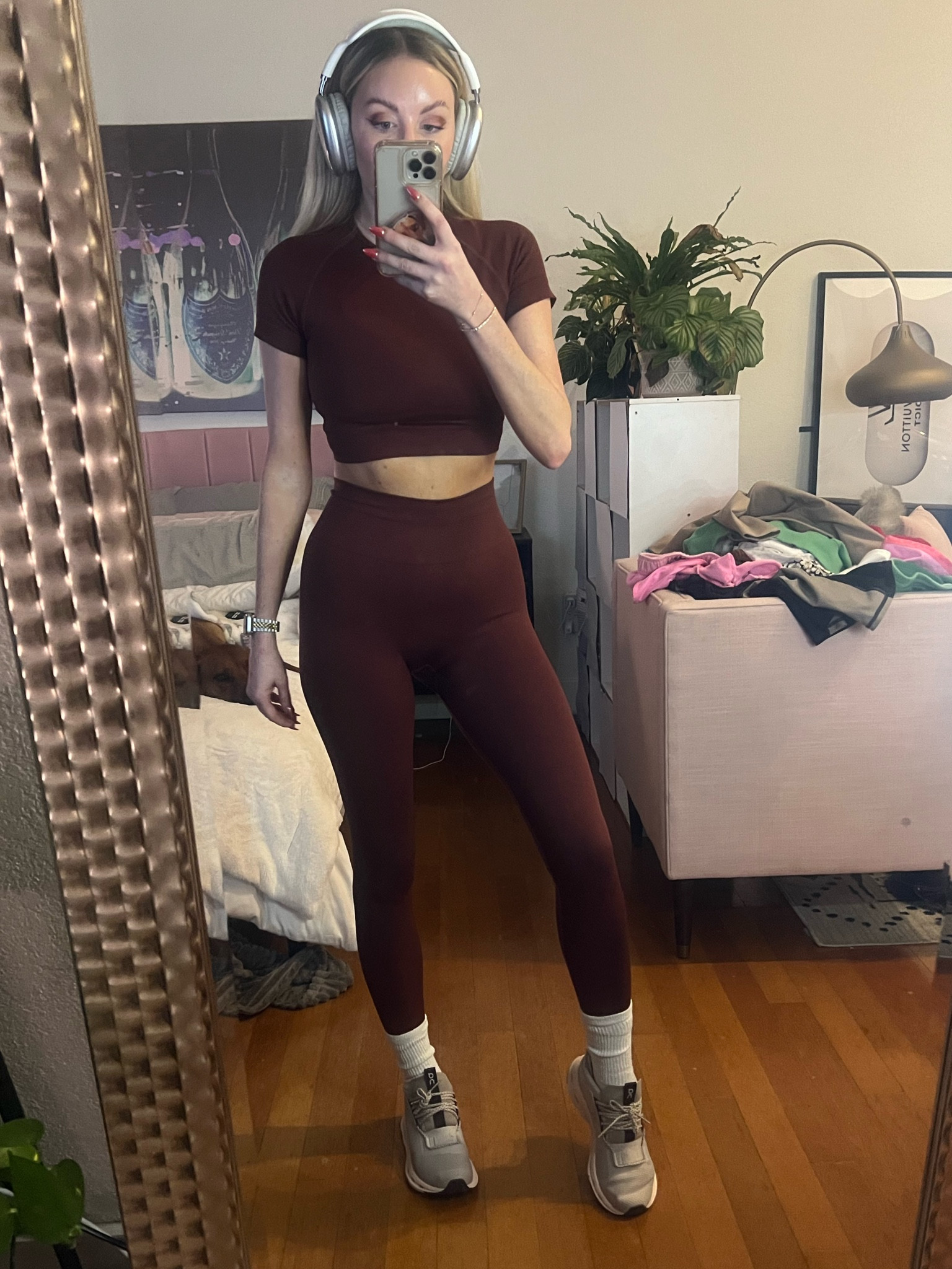 I absolutely love how the matching burgundy crop top and high-waisted leggings create a sleek, cohesive look that is perfect for both workouts and casual outings. The neutral sneakers and simple accessories keep the ensemble comfortable yet stylish.