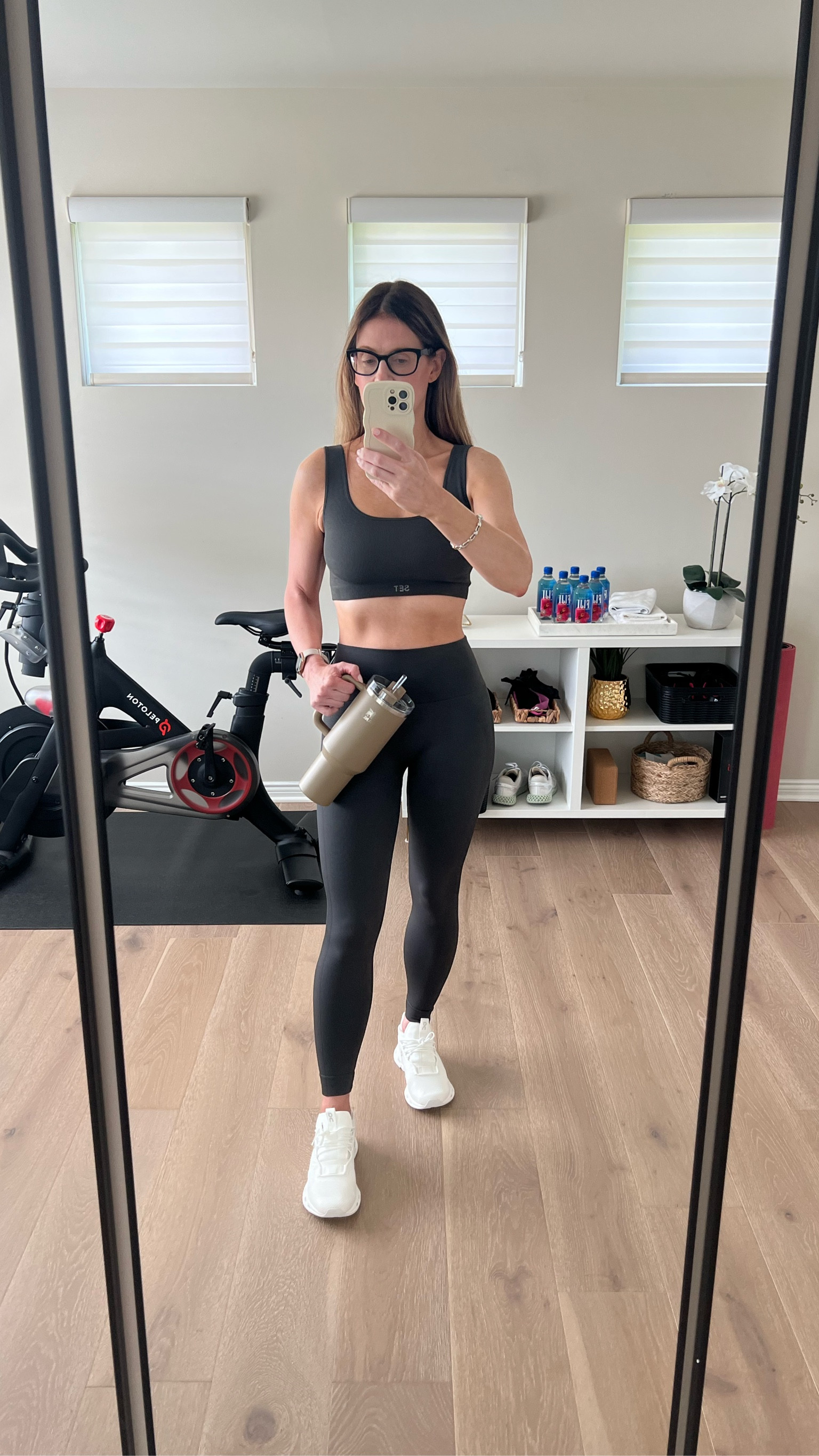 I love how this outfit effortlessly combines functionality and style, with the fitted activewear highlighting a toned physique. The sleek monochrome look, complemented by the chic accessories, exudes confidence and a keen sense of fashion.