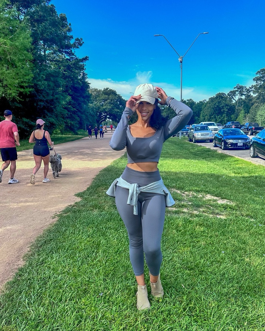 I love how this outfit flawlessly combines comfort and style with its cohesive color scheme and sleek design, making it perfect for both active and casual settings. The matching hat adds a sporty touch, while the gold jewelry elevates the look effortlessly.