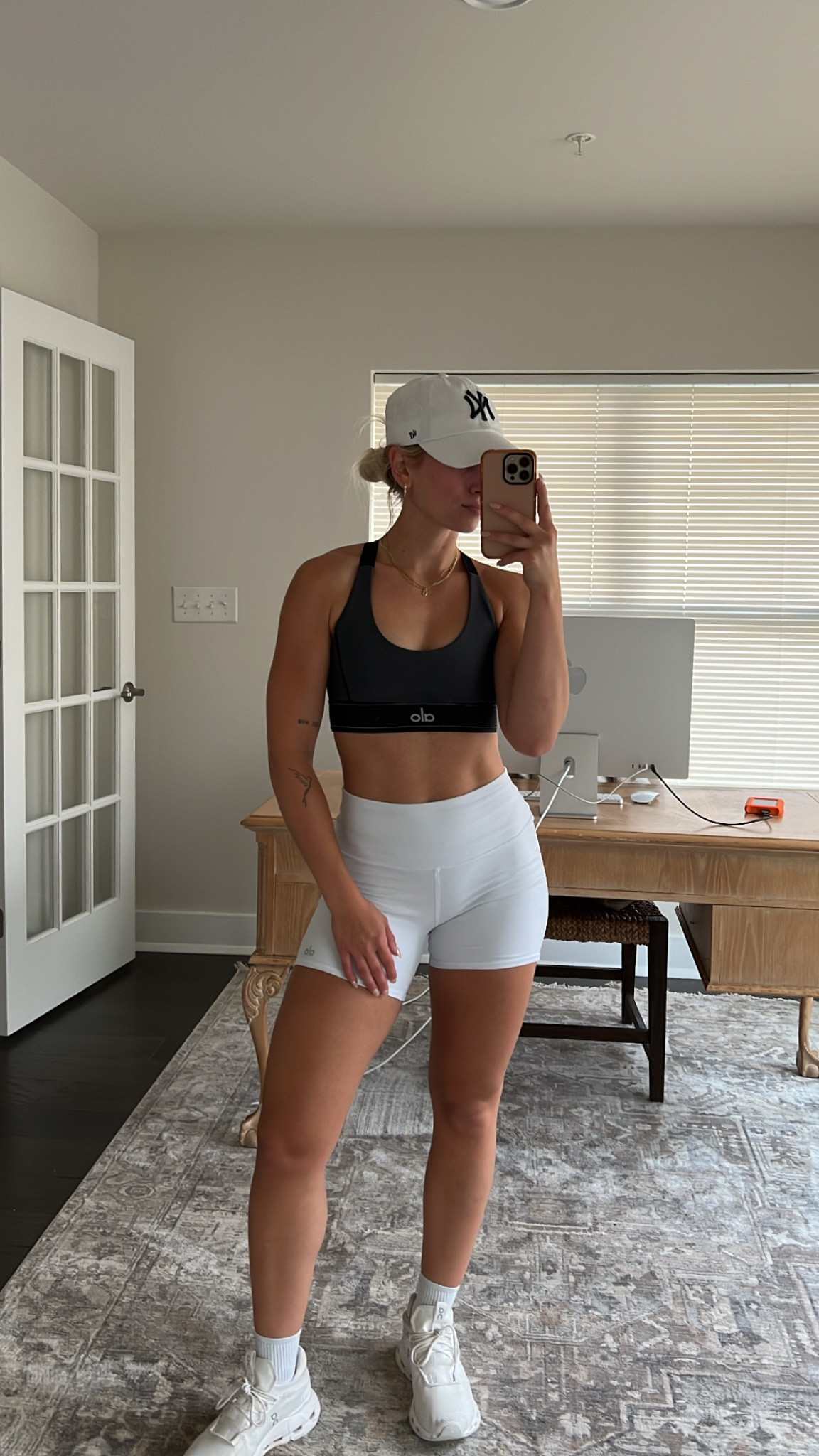 I love this outfit because it perfectly balances comfort and style with its sleek, fitted design and soothing color. The coordination of the cap, matching sports bra, and high-waisted shorts creates a cohesive, athleisure look that’s both functional and fashionable.