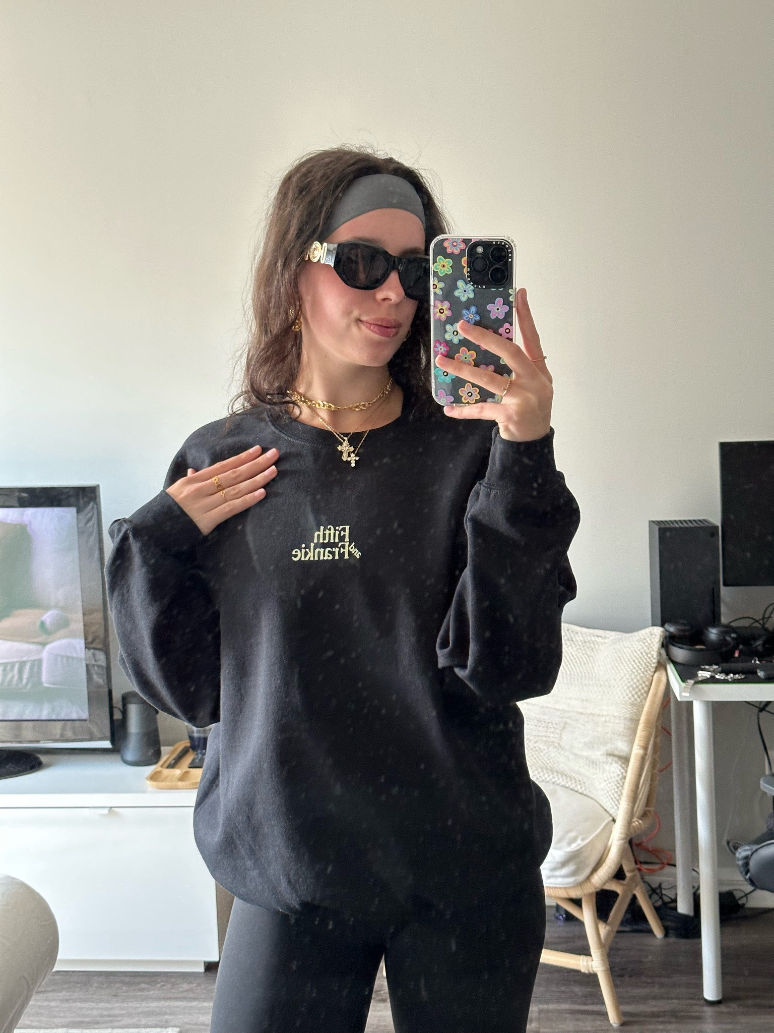I love how the all-black ensemble creates a chic, streamlined look while the oversized sweater adds a touch of cozy, effortless cool. The bold accessories, like the statement sunglasses and layered necklaces, bring just the right amount of personality and flair to the outfit.