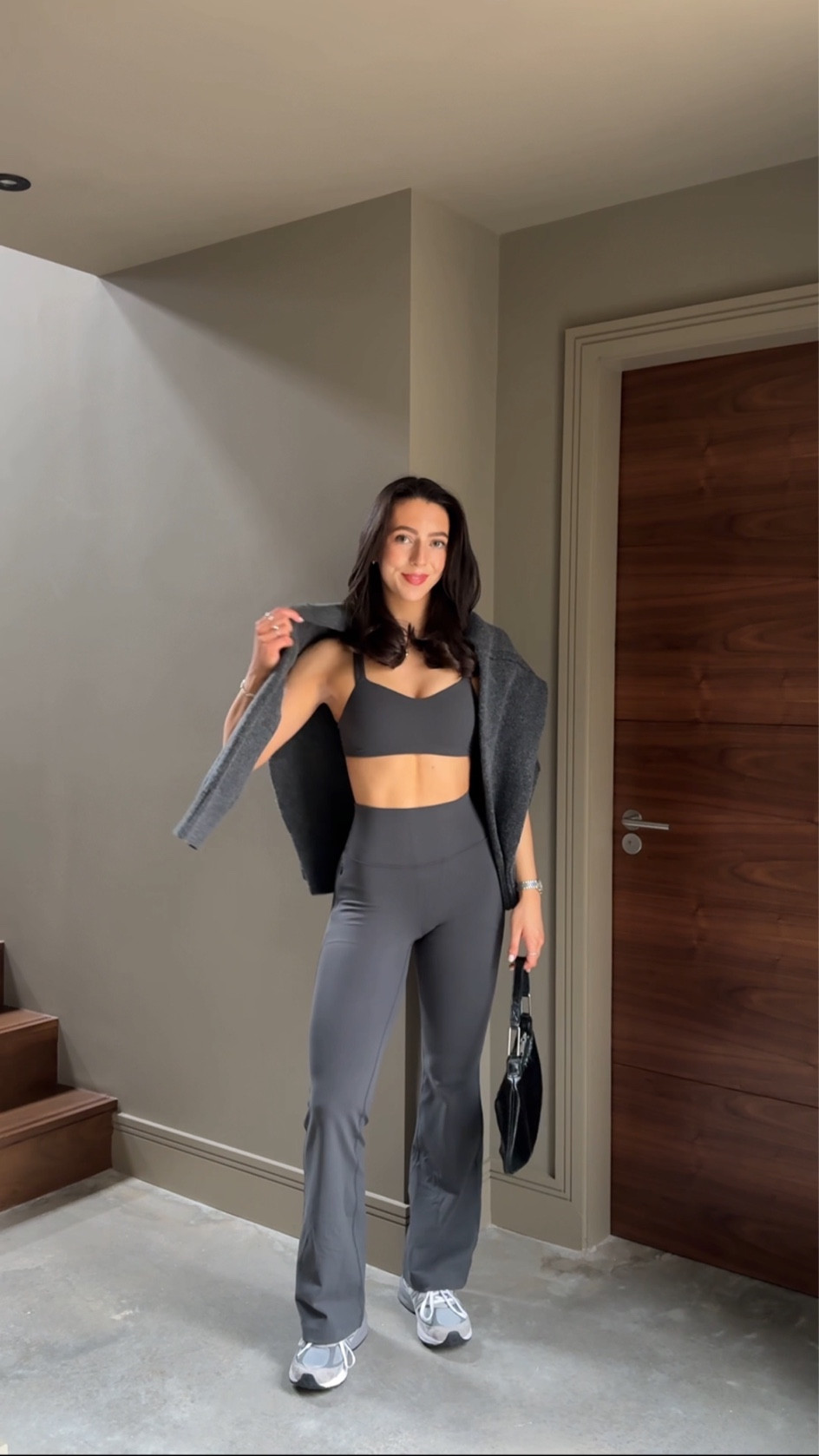 I love how this outfit strikes a balance between sporty and chic; the coordinated grey tones create a sleek silhouette, while the blazer adds a sophisticated touch. Plus, the comfortable yet stylish elements make it perfect for a casual yet polished look.