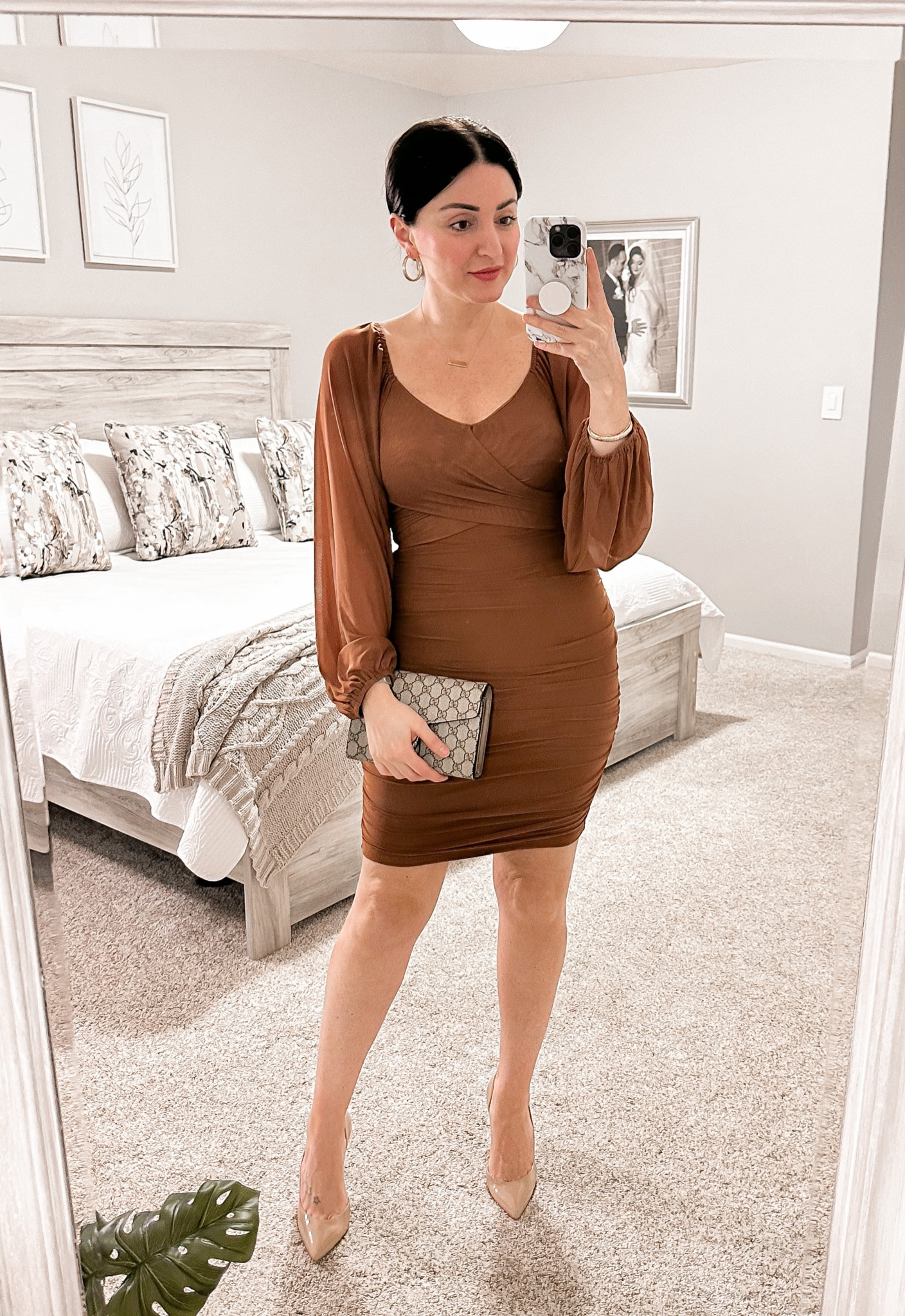 – I love how the warm brown dress fits snugly, creating a sleek silhouette.