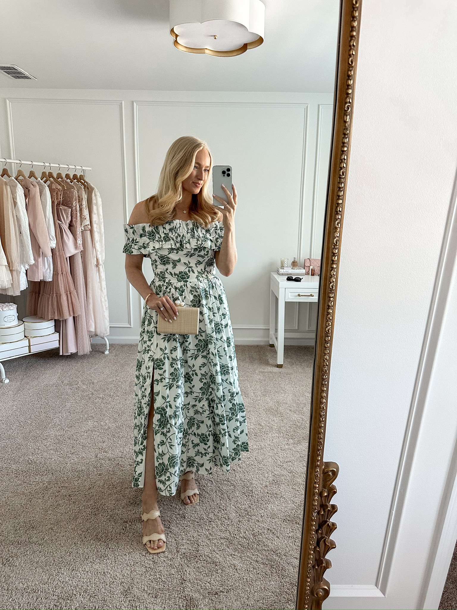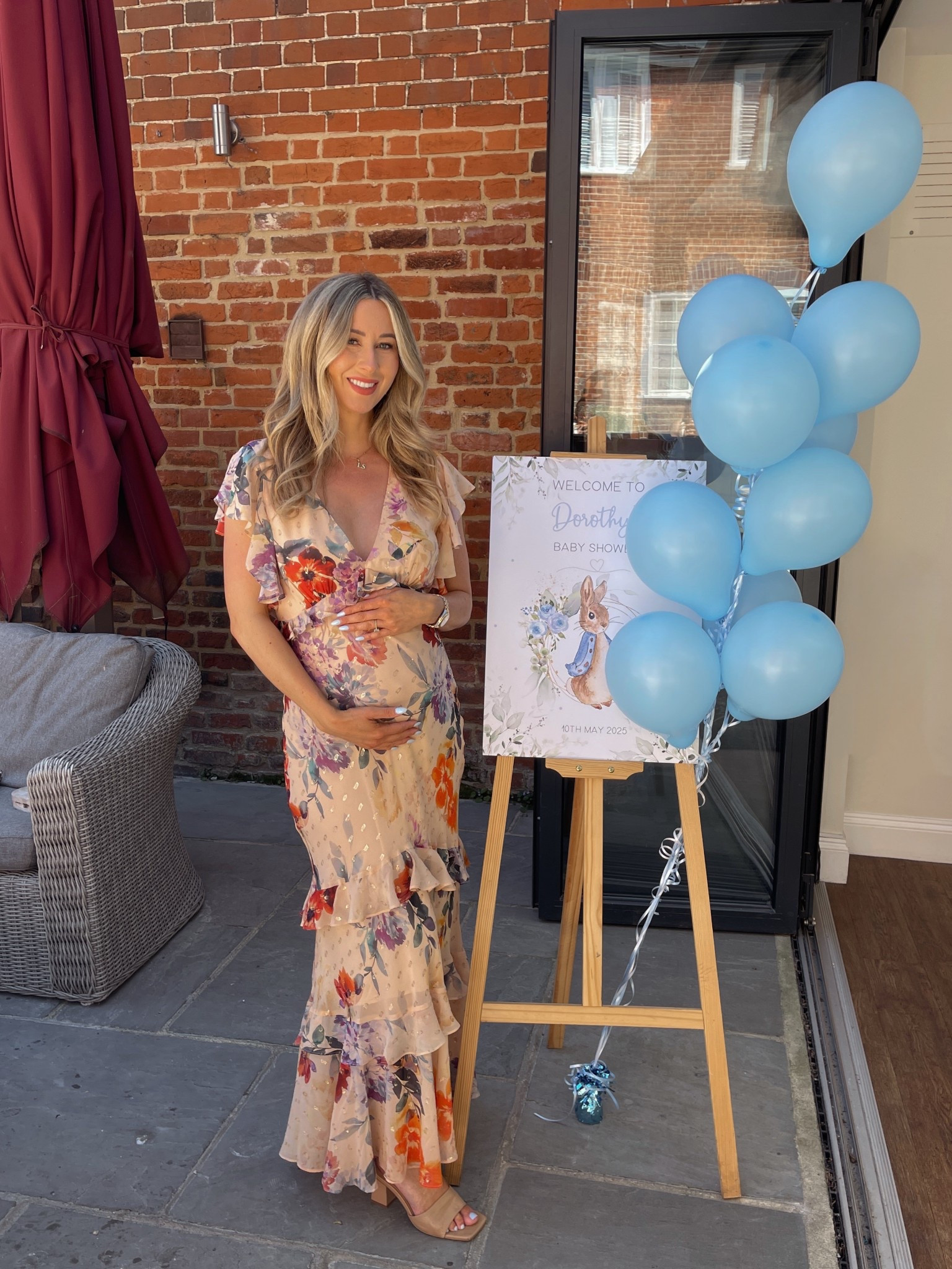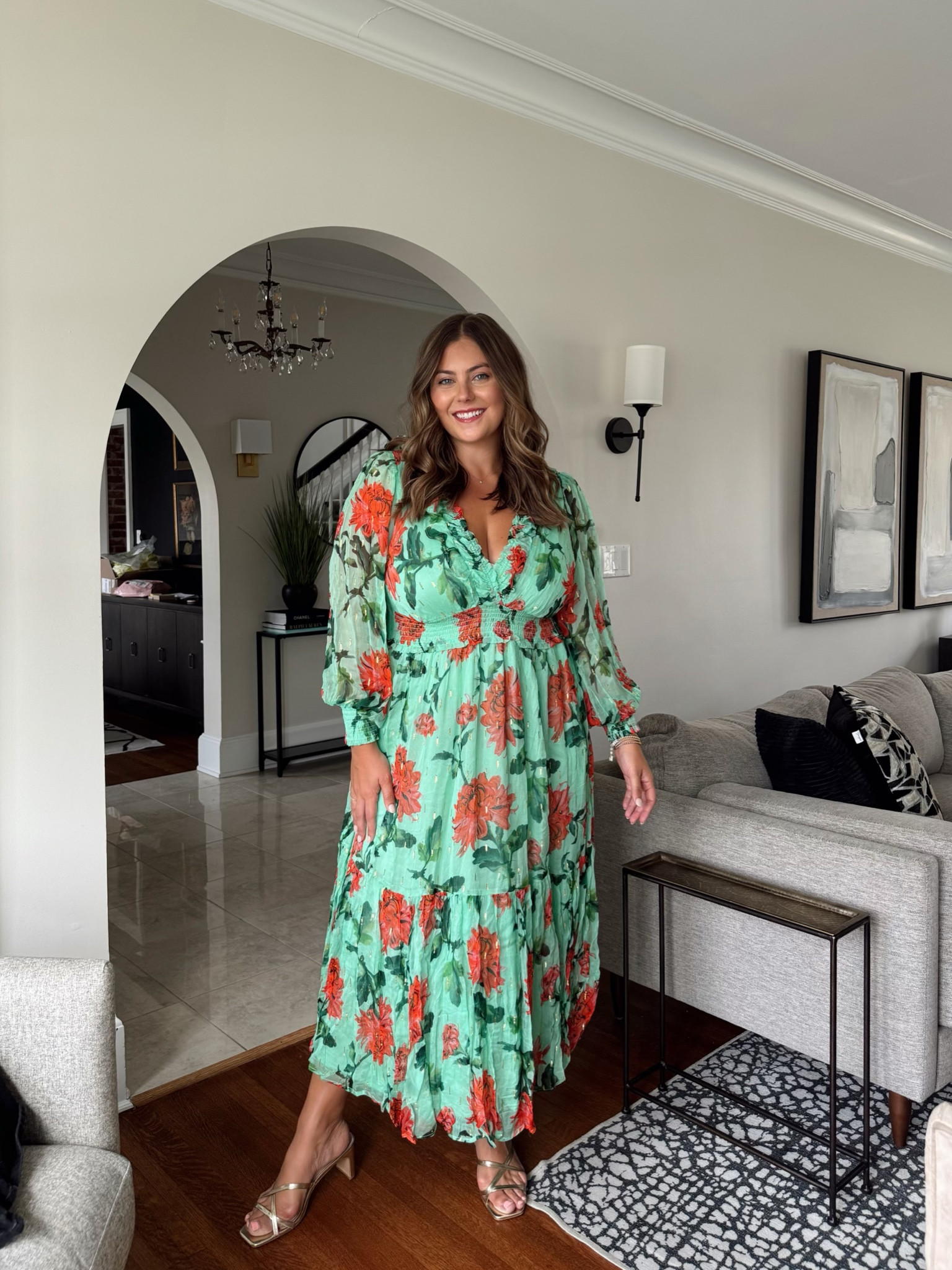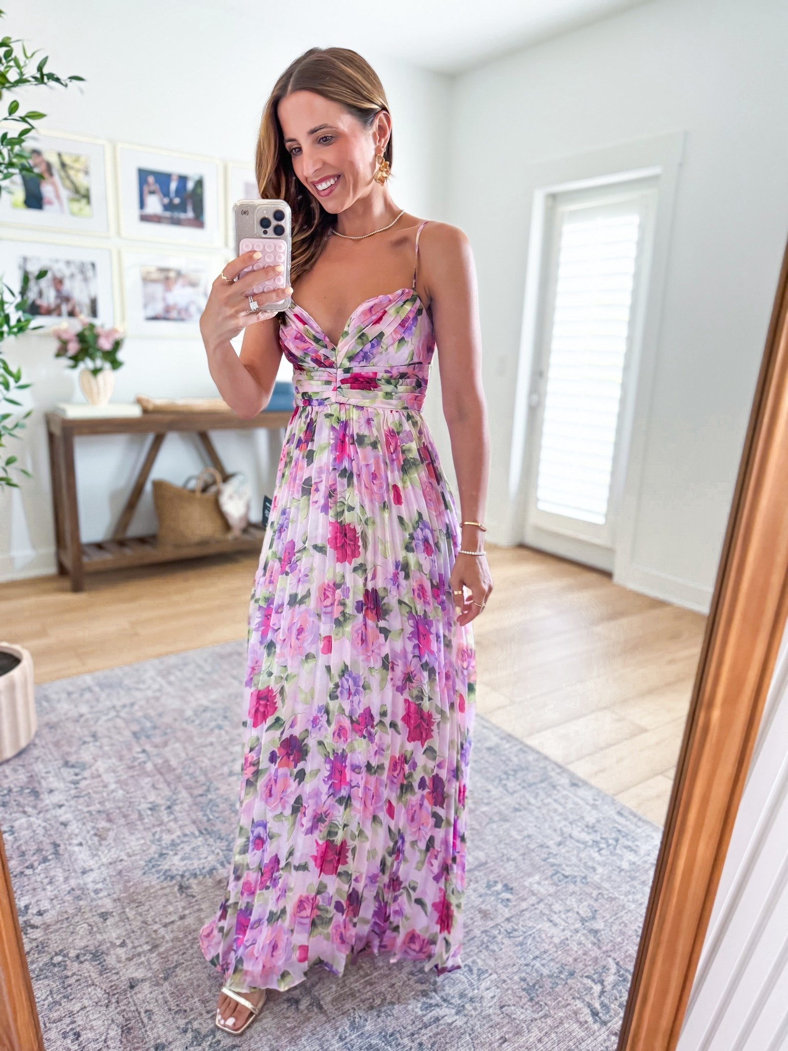 – I love the soft floral pattern on the dress; it feels perfect for a celebration.