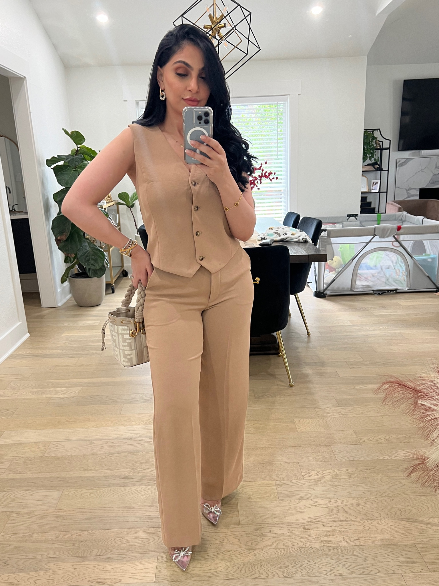 – The tailored vest and wide-leg pants complement each other perfectly for a chic vibe.
