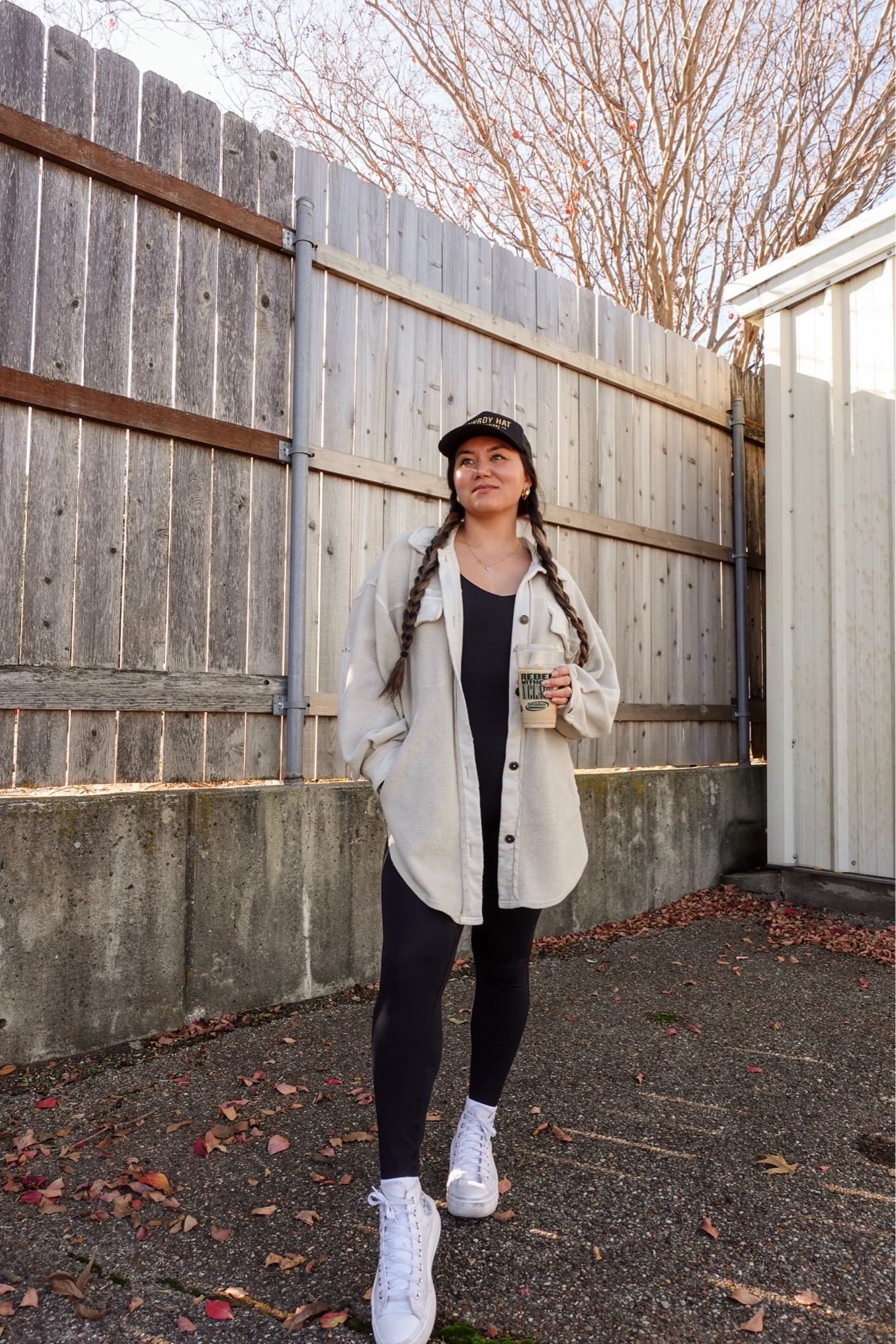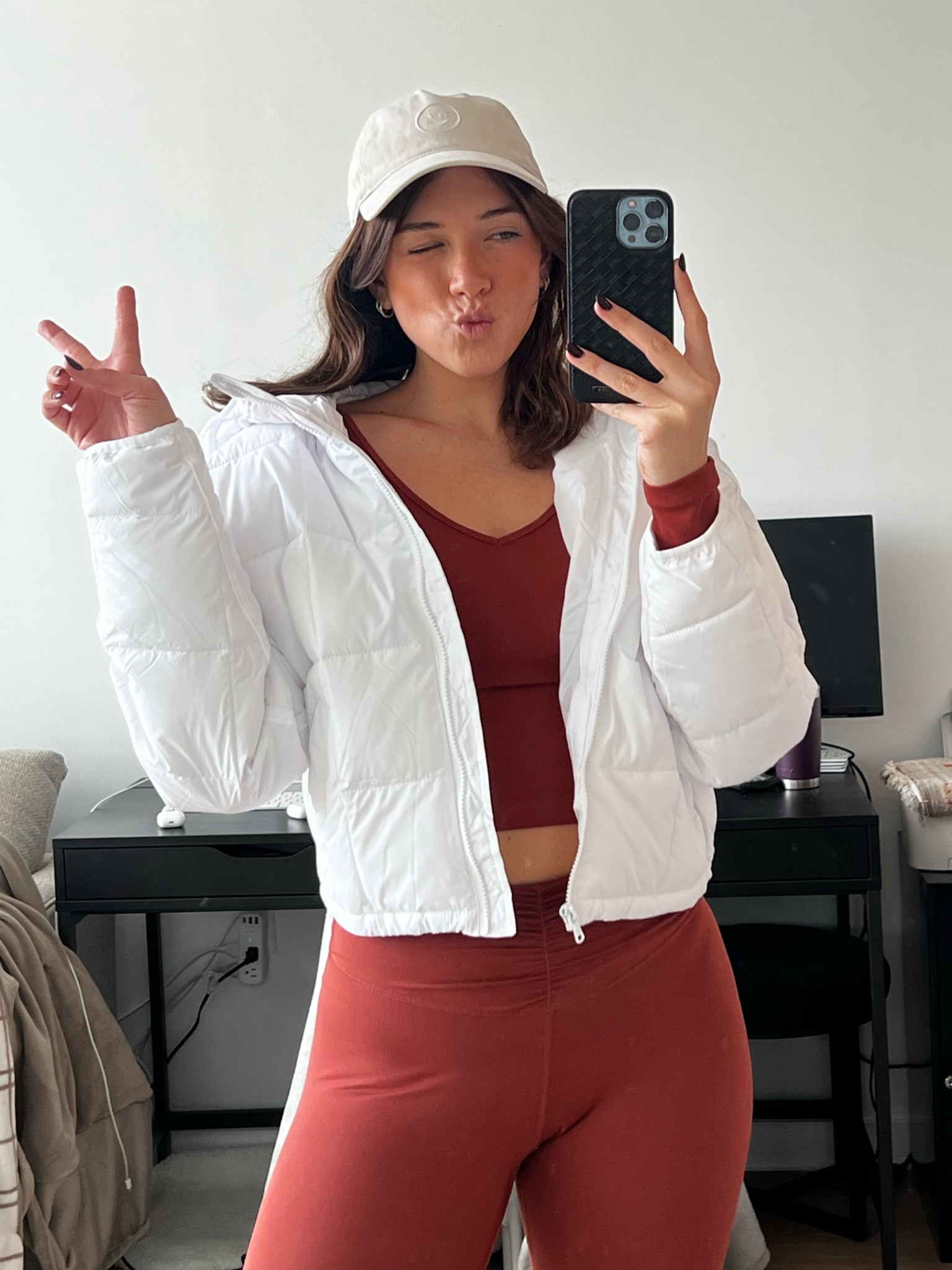 The crisp white jacket offers a fresh and versatile layering piece that contrasts beautifully with the warm, earthy tones of the fitted top and leggings, creating a harmonious balance between comfort and style. The ensemble is elevated with the subtle interplay of relaxed and sporty vibes, suggesting an effortlessly chic aesthetic ideal for a casual outing.