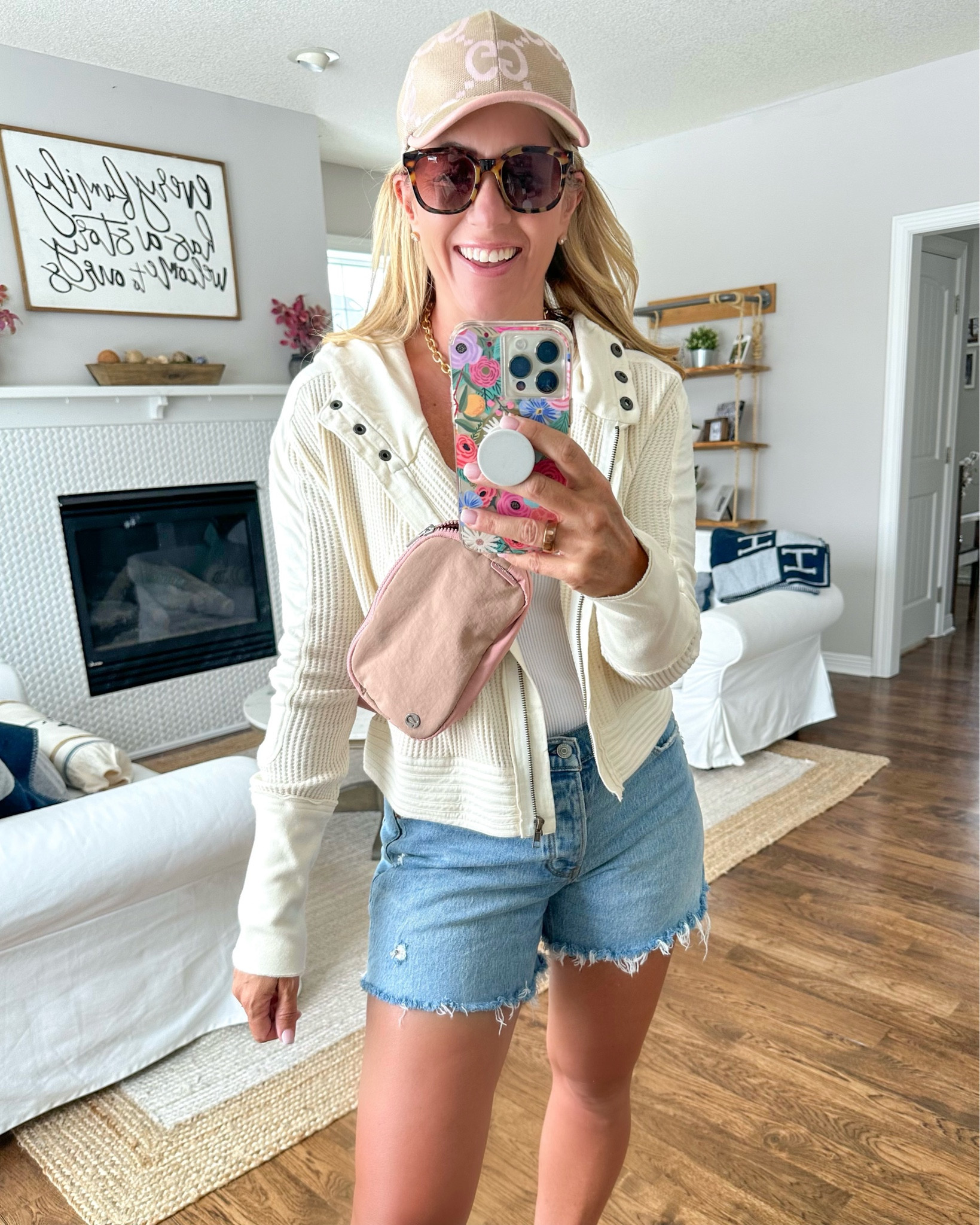 The ensemble effortlessly combines casual and chic with its distressed denim shorts and crisp white cardigan, providing a perfect balance for a relaxed yet put-together look. Accessories like the cap, sunglasses, and crossbody bag add a practical yet stylish touch that’s ideal for a sunny day out.