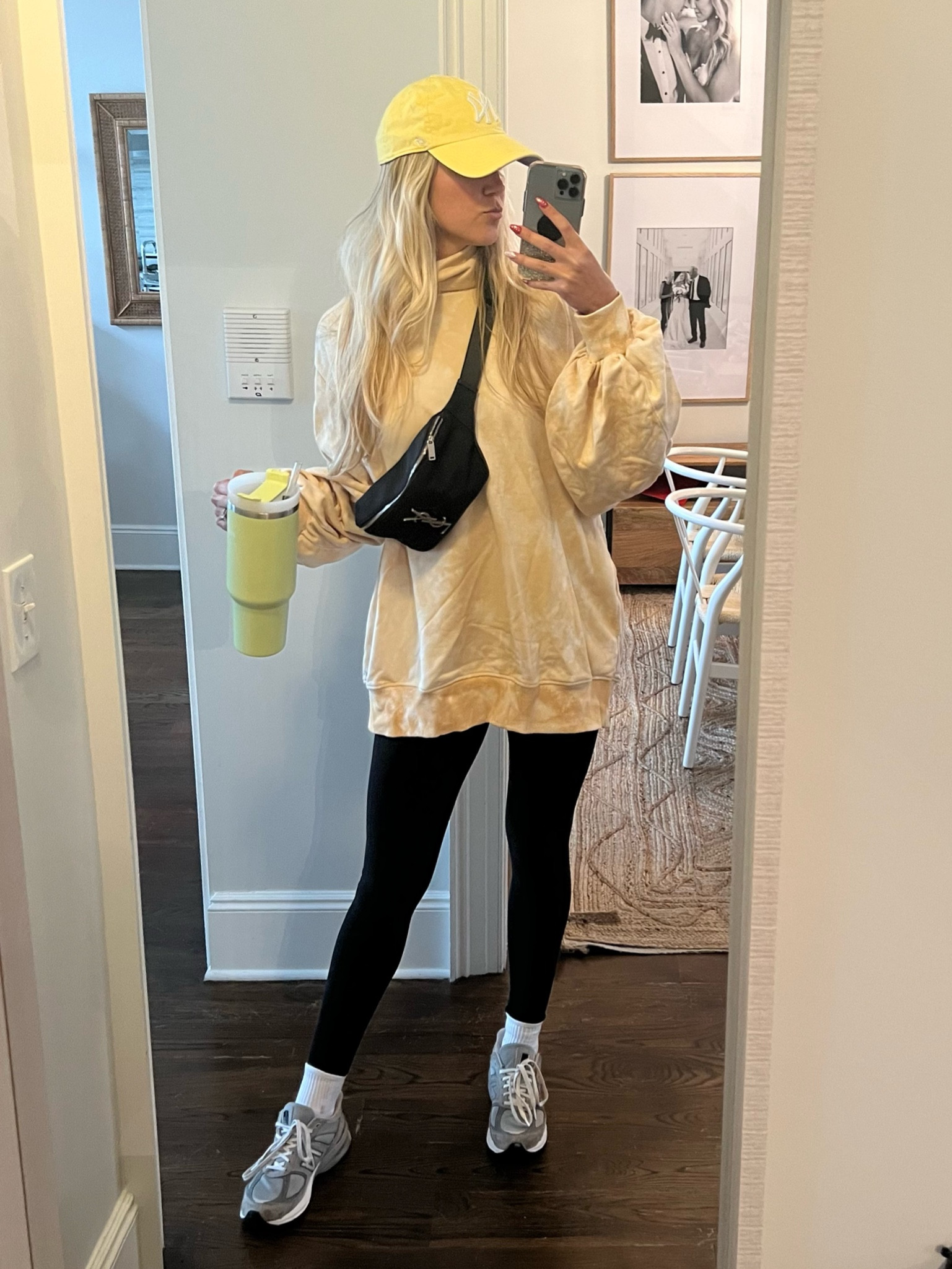 The relaxed fit of the yellow anorak paired with black leggings creates an effortlessly chic athleisure look, while the pop of color adds a playful yet trendy touch. Accessories like the cap, sneakers, and crossbody bag enhance functionality without sacrificing style.