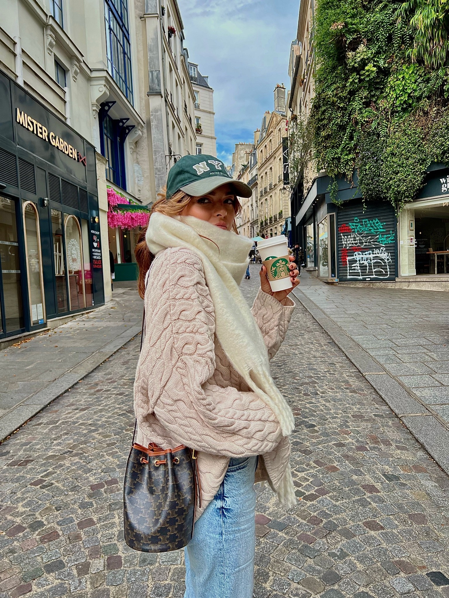The ensemble perfectly combines comfort and style with a cozy, textured knit sweater and classic straight-leg jeans, infused with a touch of urban chic through the pairing of a stylish cap and designer handbag. The neutral palette is effortlessly sophisticated, making it suitable for a casual stroll in the city while staying fashion-forward.