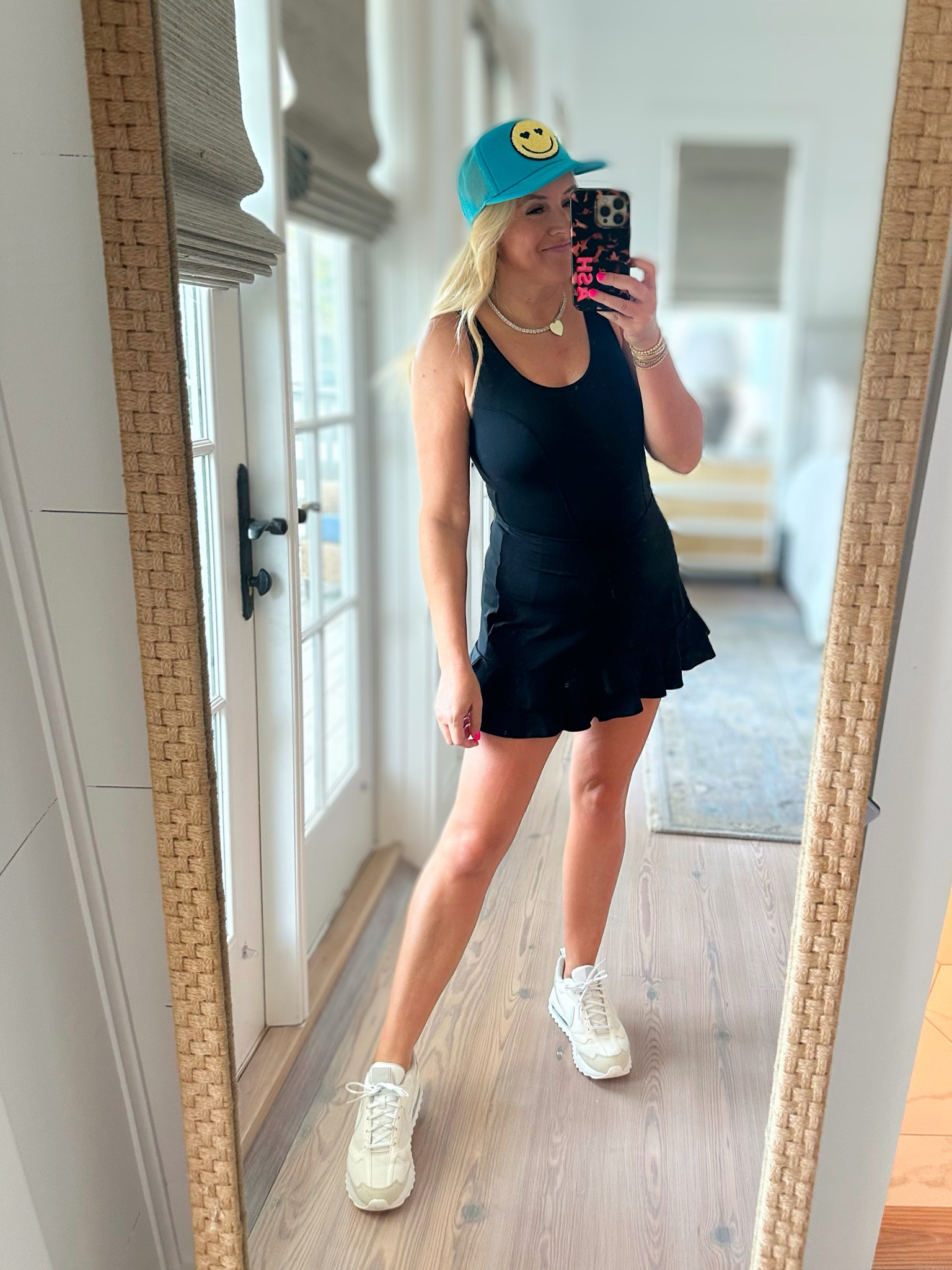 The black tank top and skort combo is a versatile and chic look, achieving a sporty yet feminine aesthetic that’s perfect for a casual day out. The bright, playful cap adds a pop of color and a sense of fun, while the clean white sneakers keep the outfit grounded and comfortable for all-day wear.