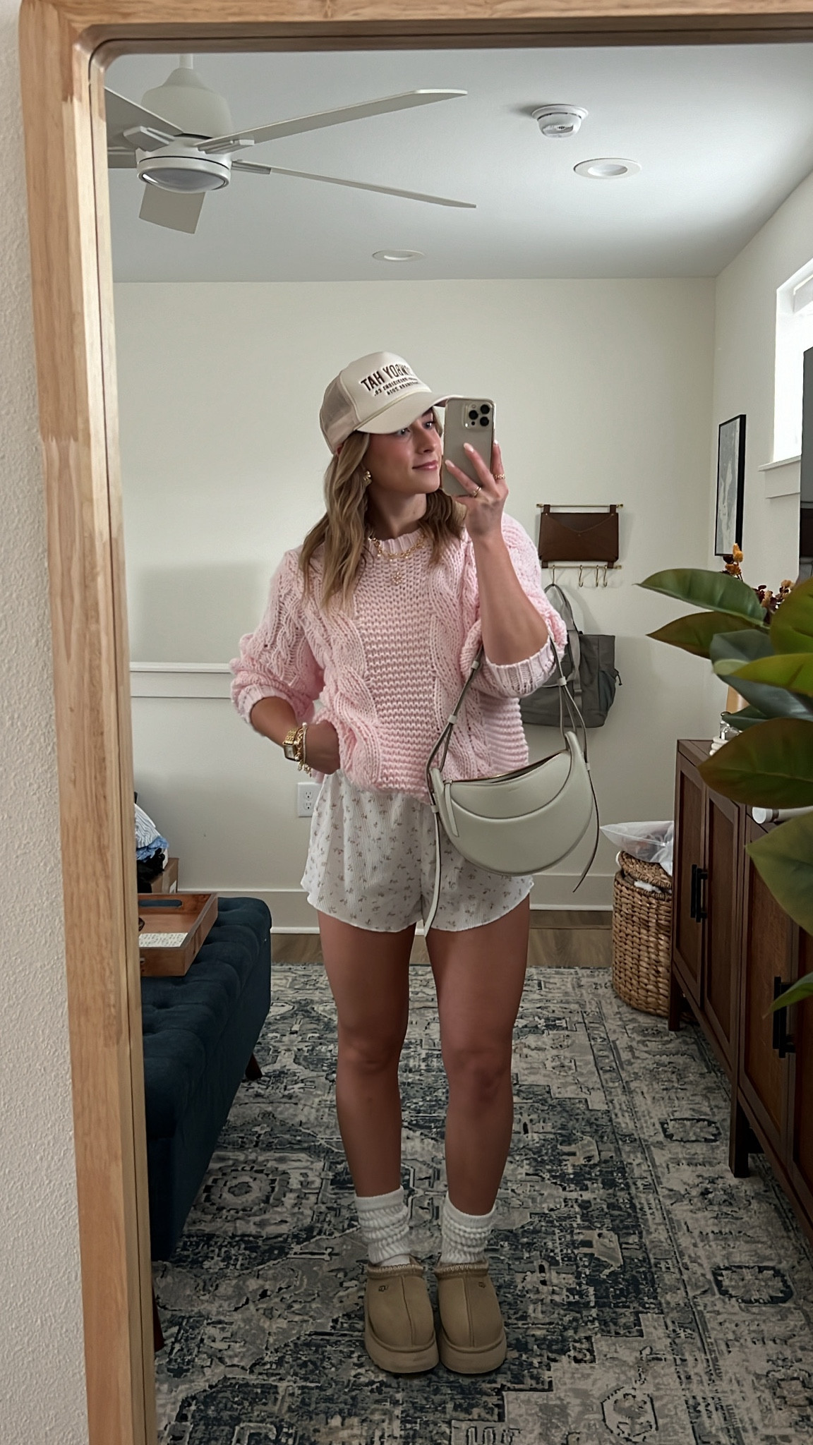 The ensemble exudes a charming casual vibe with its well-balanced mix of textures; the cozy knit of the sweater pairs delightfully with the light, floral shorts. Accessories like the cap and chunky boots add a trendy, street-style edge, while the crossbody bag brings a practical yet fashionable touch.