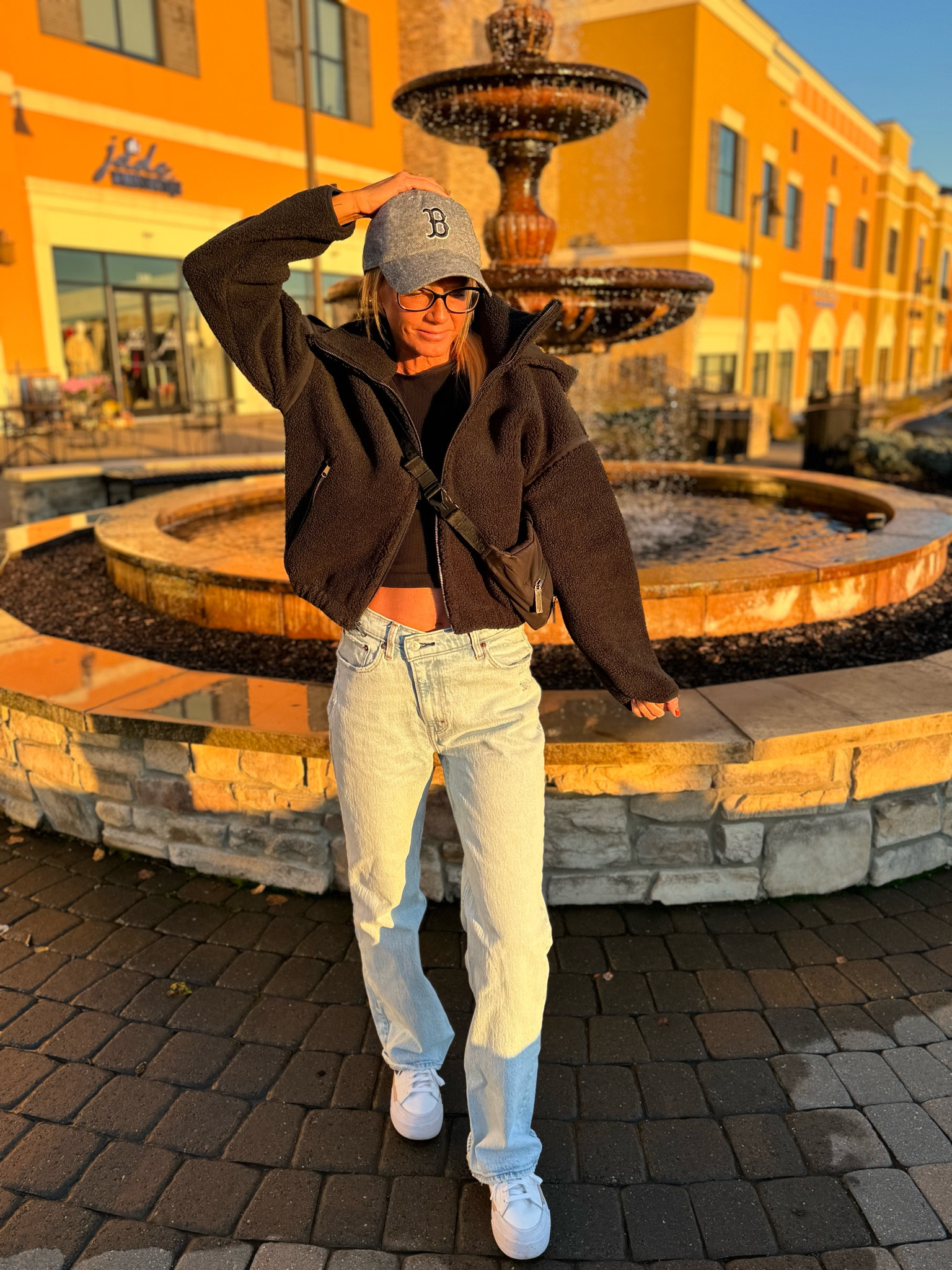 The relaxed fit of the light-washed jeans paired with the cropped hoodie strikes a perfect balance between comfort and style, while the classic white sneakers add a clean, effortless finish to the ensemble. The minimalistic approach, accentuated with the trendy sunglasses, gives off an air of cool, urban chic.