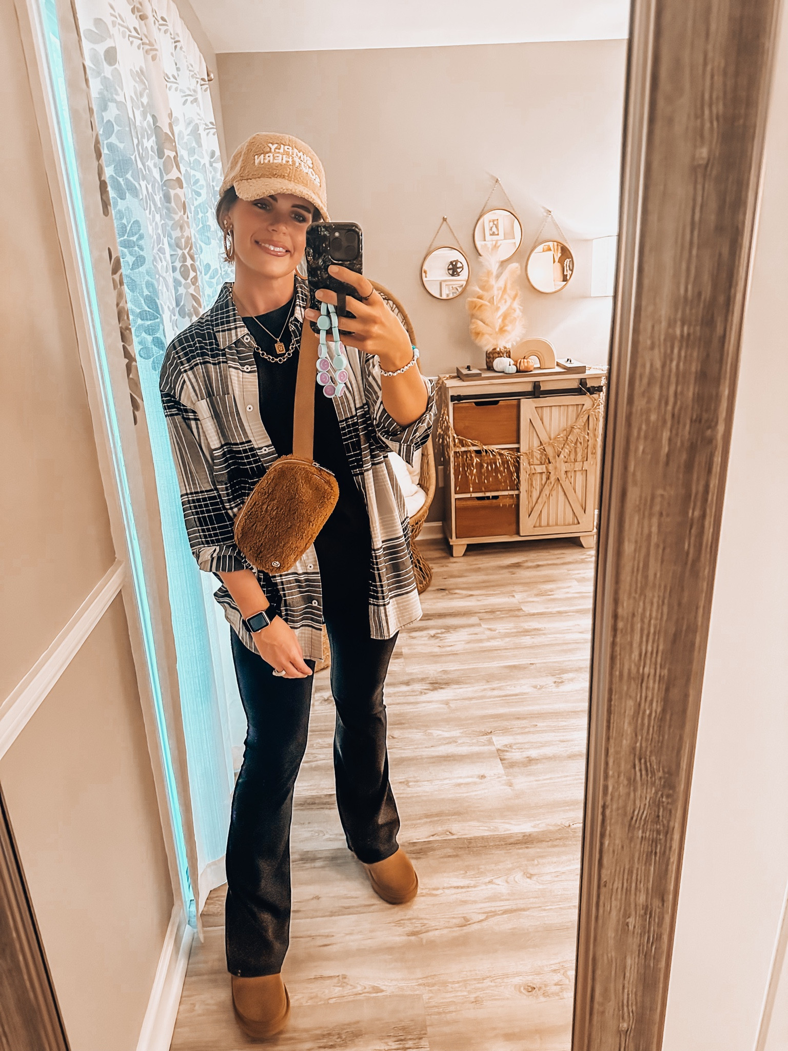 The ensemble expertly balances comfort and style, with the oversized plaid shirt adding a trendy, casual flair paired with classic jeans. The beanie adds a cozy touch while the unique purse lends a playful pop of personality to the outfit.