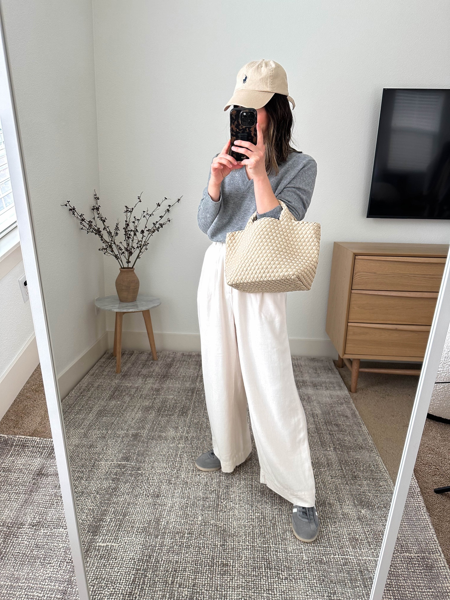 The outfit exudes a relaxed yet chic aesthetic, combining the slouchy comfort of the wide-leg pants with a structured sweater to create a balanced silhouette. The neutral color palette is sophisticated and versatile, enhanced by the texture of the bag which adds an element of interest.