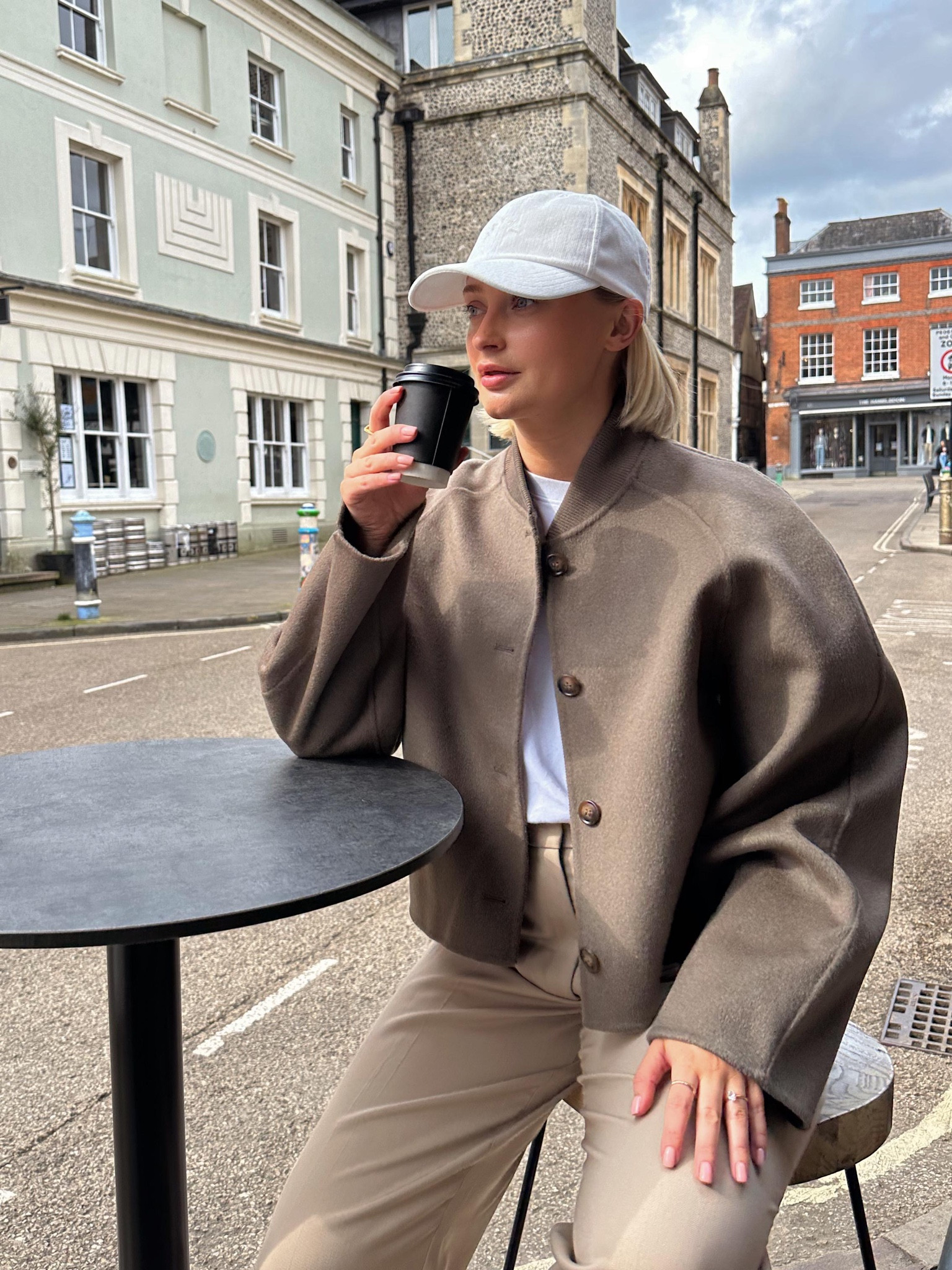 The outfit strikes a perfect balance between comfort and style with its loose-fitting layers and neutral color palette, exuding a relaxed yet chic vibe. The effortless mix of casual and structured pieces, like pairing a simple baseball cap with a tailored coat, truly encapsulates a modern, urban fashion sensibility.