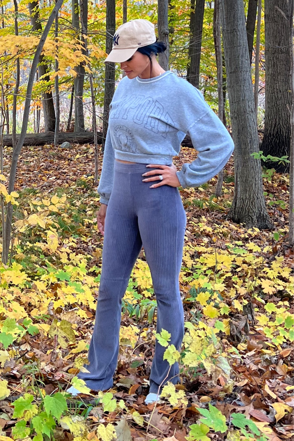 The high-waisted ribbed trousers elongate the silhouette, creating a sleek and elegant line, while the cropped sweatshirt adds a playful touch, balancing casual comfort with a trendy twist. The soft, monochromatic palette complements the autumnal backdrop, making the ensemble season-appropriate and visually harmonious.
