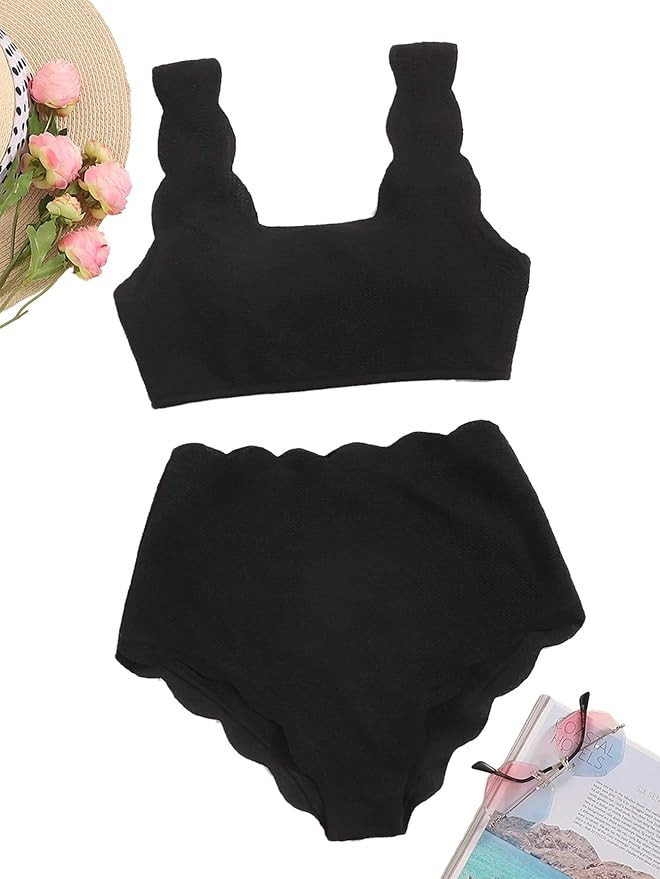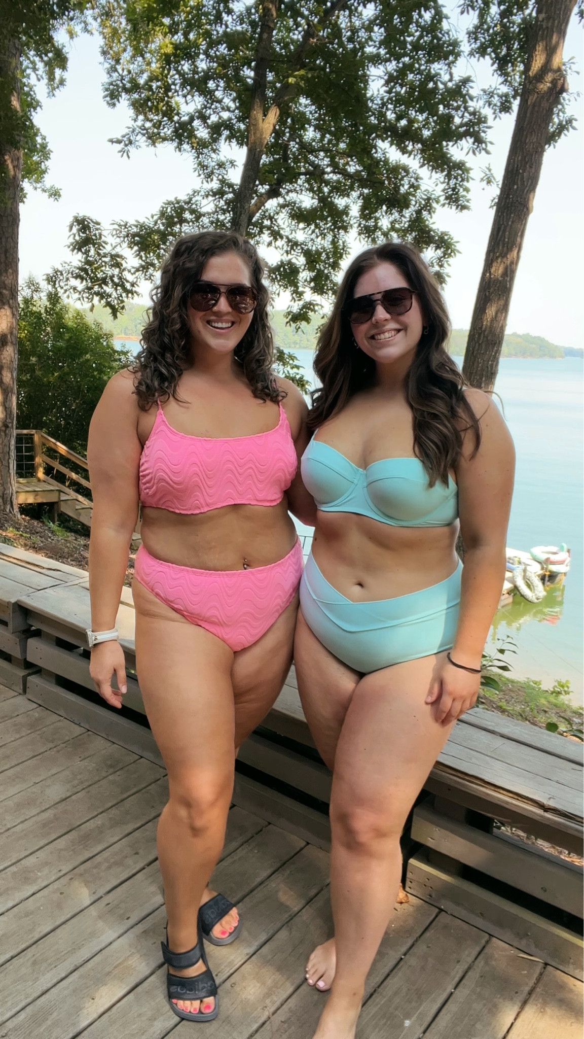 I love how the vibrant colors of both swimsuits complement the scenic background, making the entire look pop. The high-waisted bikini bottoms are flattering and provide a stylish, retro vibe that is both comfortable and chic.