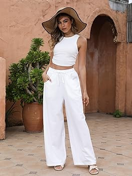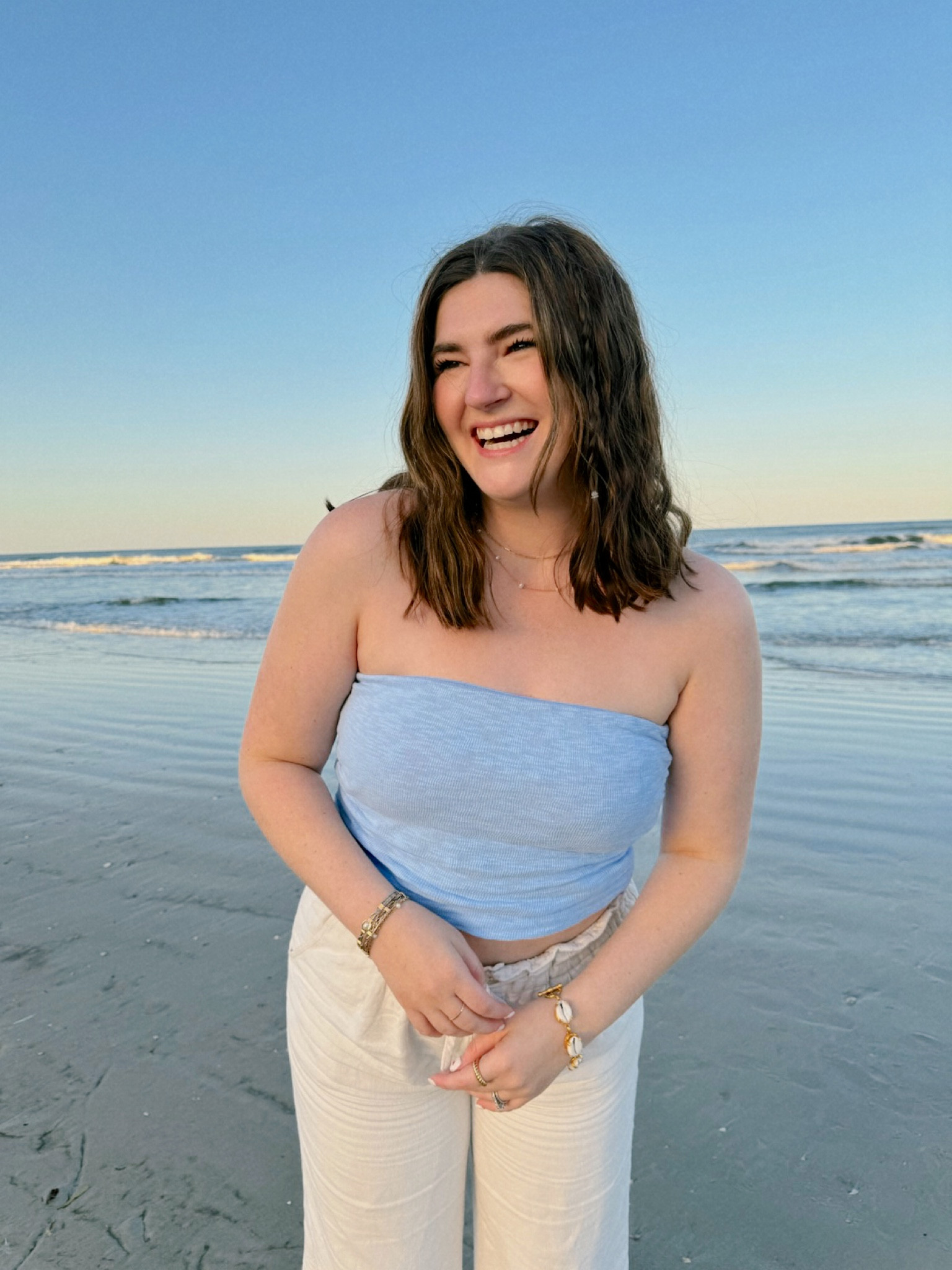 I love this outfit because the light blue tube top perfectly complements the beach setting, enhancing the airy, relaxed vibe. Paired with the high-waisted white pants, it creates a fresh and stylish contrast that’s both comfortable and chic for a seaside stroll.