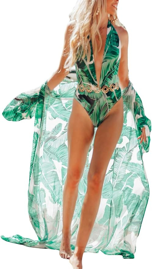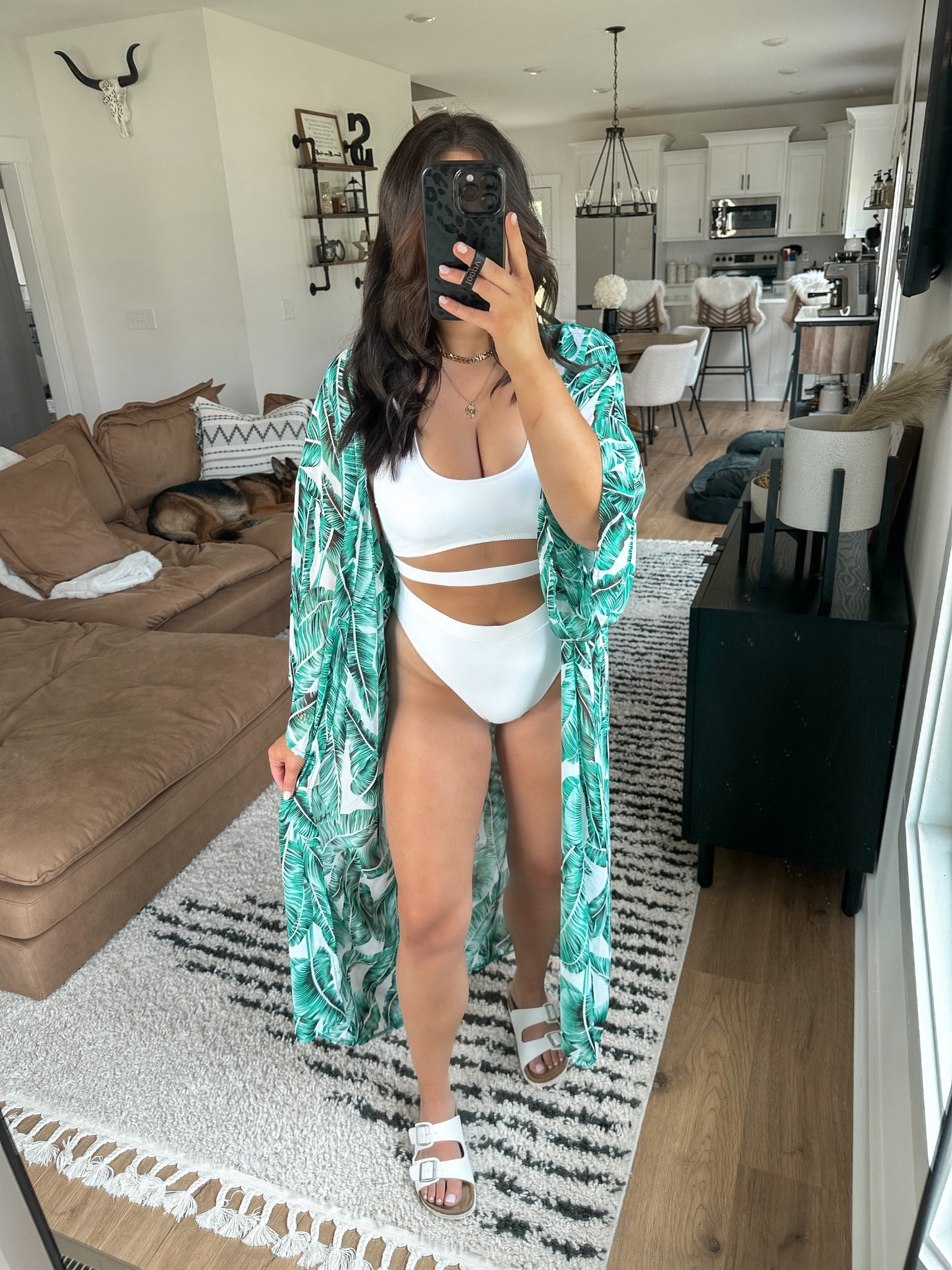 I love how the bold, tropical-printed cover-up adds a vibrant pop of color while effortlessly complementing the sleek, chic white bikini. The sandals tie the look together with casual elegance, perfect for a relaxed summer day.