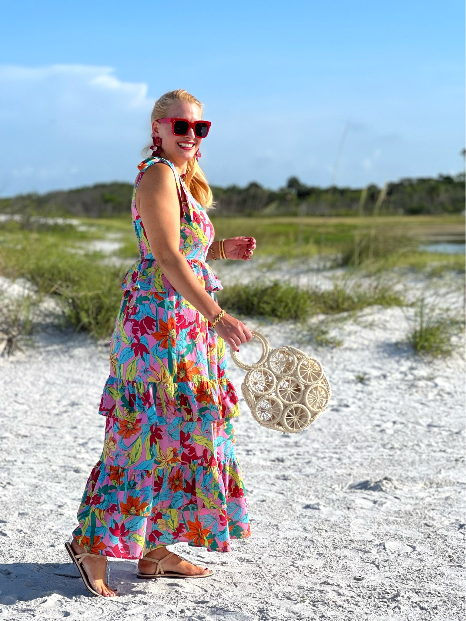 I love how this vibrant floral maxi dress perfectly complements the beach setting, while the layered ruffles and fun accessories add a playful touch. The bright colors and bold patterns make it a standout, effortlessly blending style and comfort for a day out.