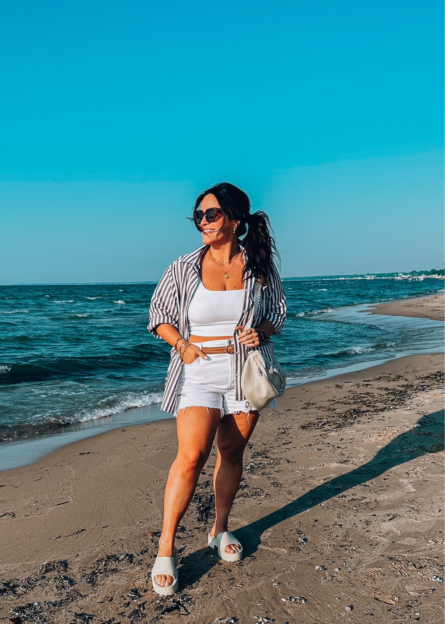 I love this outfit because it perfectly combines a chic beach vibe with its breezy, striped shirt and high-waisted white shorts. The minimalist accessories and comfortable slides complete the look, making it effortlessly stylish and ideal for a sunny day by the sea.