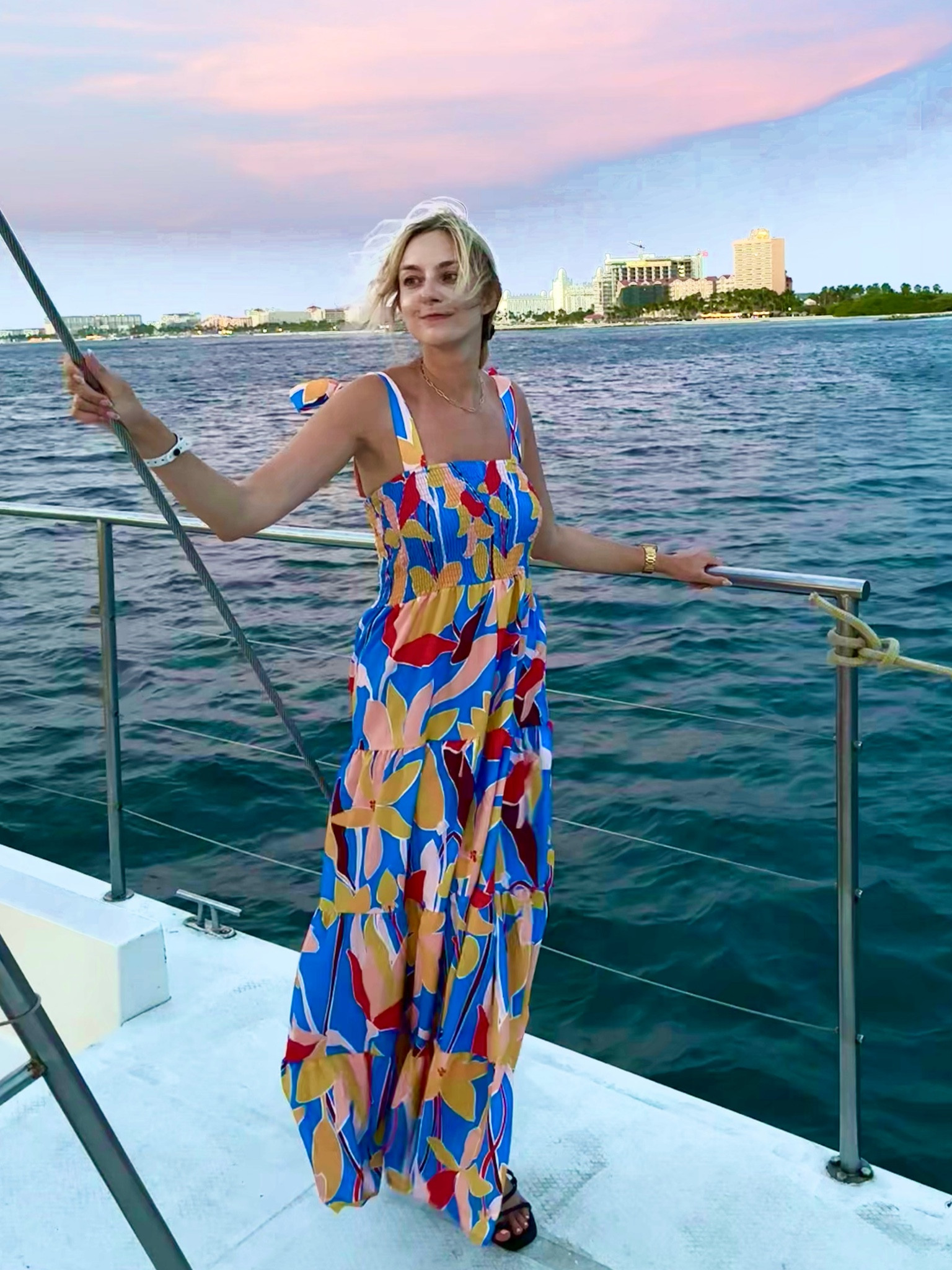 I adore this outfit because the vibrant floral print exudes a lively, summery vibe, and the breezy, flowy design is perfect for a relaxed yet stylish look on a boat outing. The bold colors beautifully complement the serene backdrop, making the ensemble truly stand out.