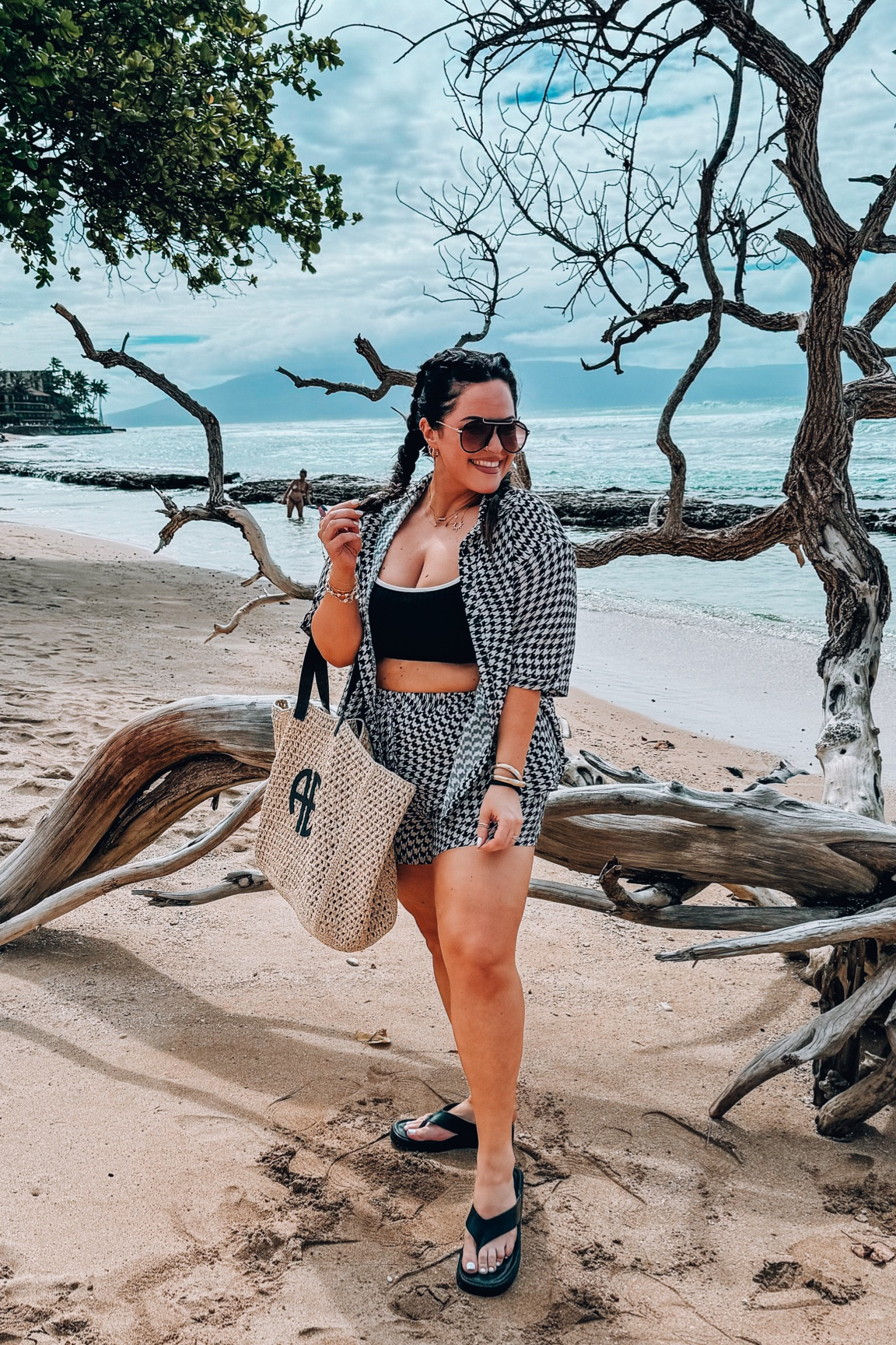 I love this outfit because it perfectly blends casual beach vibes with chic, coordinated patterns, making it ideal for a summer day. The oversized sunglasses and stylish tote bag add a touch of sophistication, completing the effortlessly cool look.