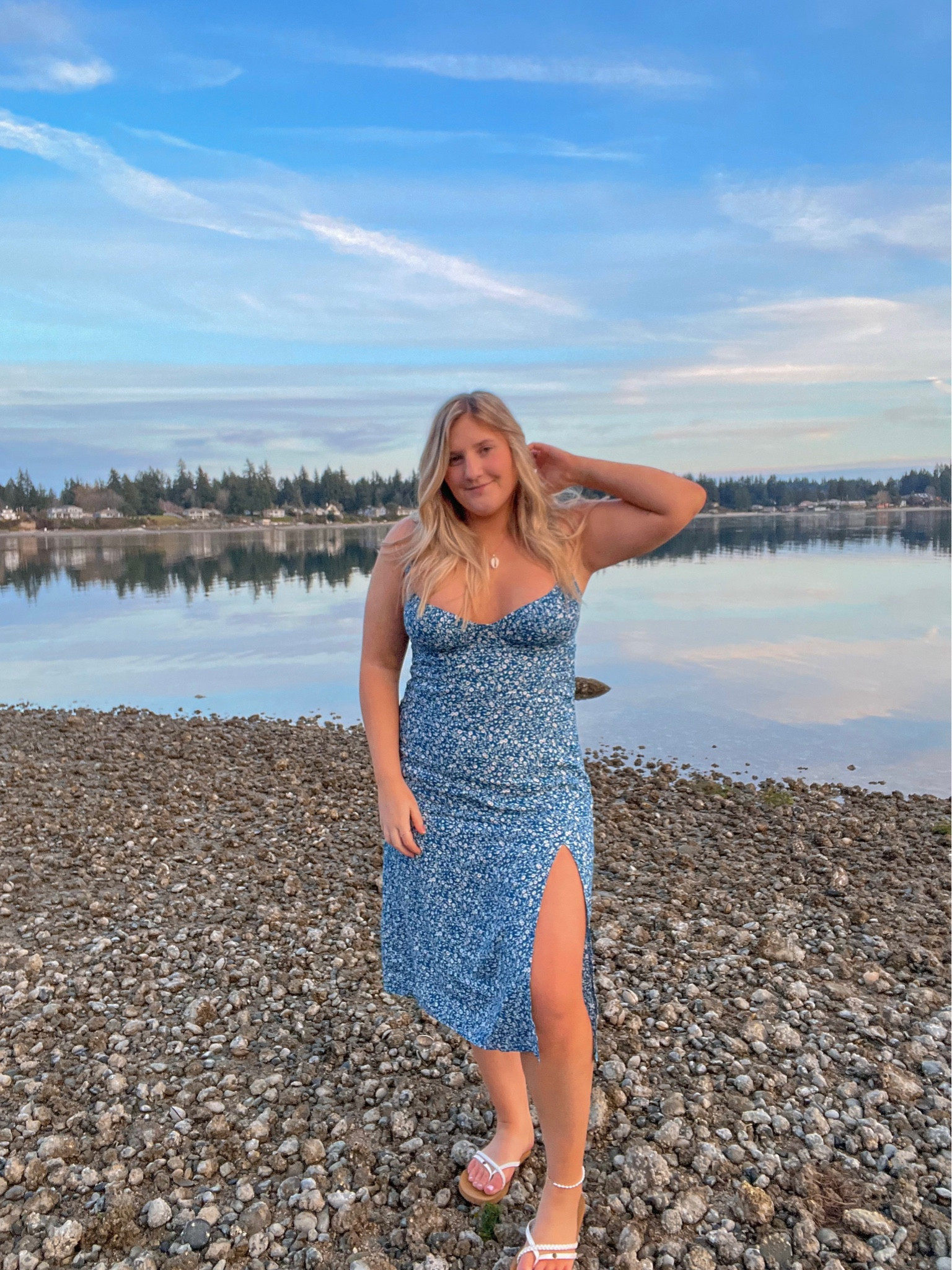 I love how this outfit effortlessly combines a flattering fitted dress with a beautiful blue floral pattern, perfectly complementing the serene lakeside backdrop. The delicate slit adds a touch of elegance and movement, making it both stylish and comfortable for a scenic outing.