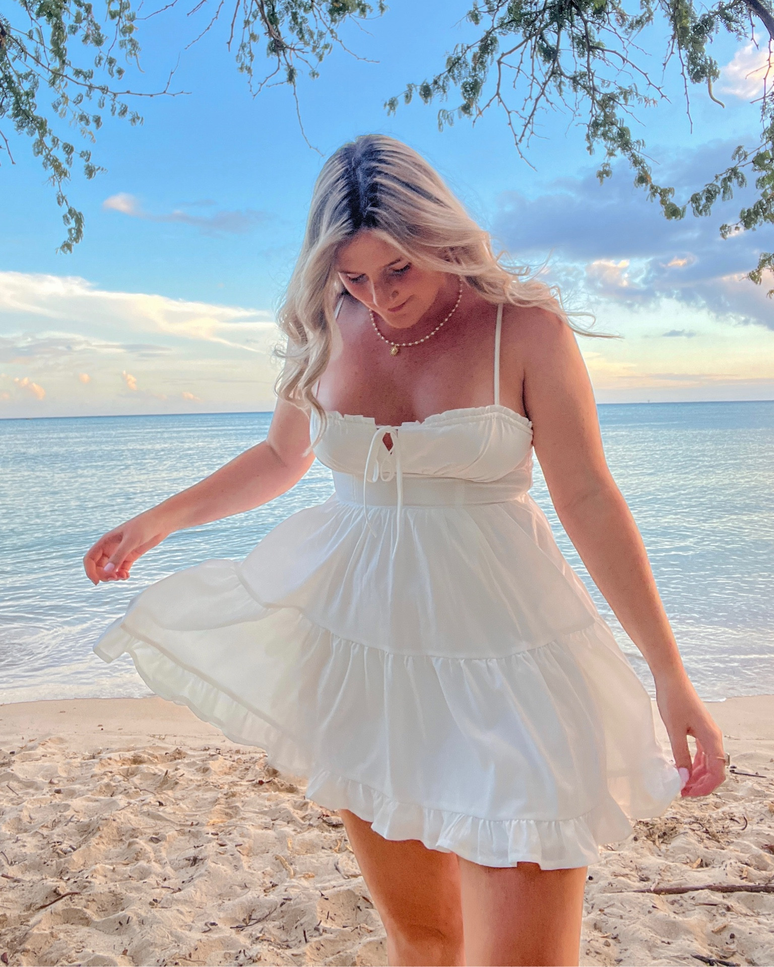 I love this outfit because the flowy, white dress complements the beach setting perfectly and creates a fresh, airy look. The simple yet elegant design with delicate straps and layered ruffles exudes a timeless summer vibe.