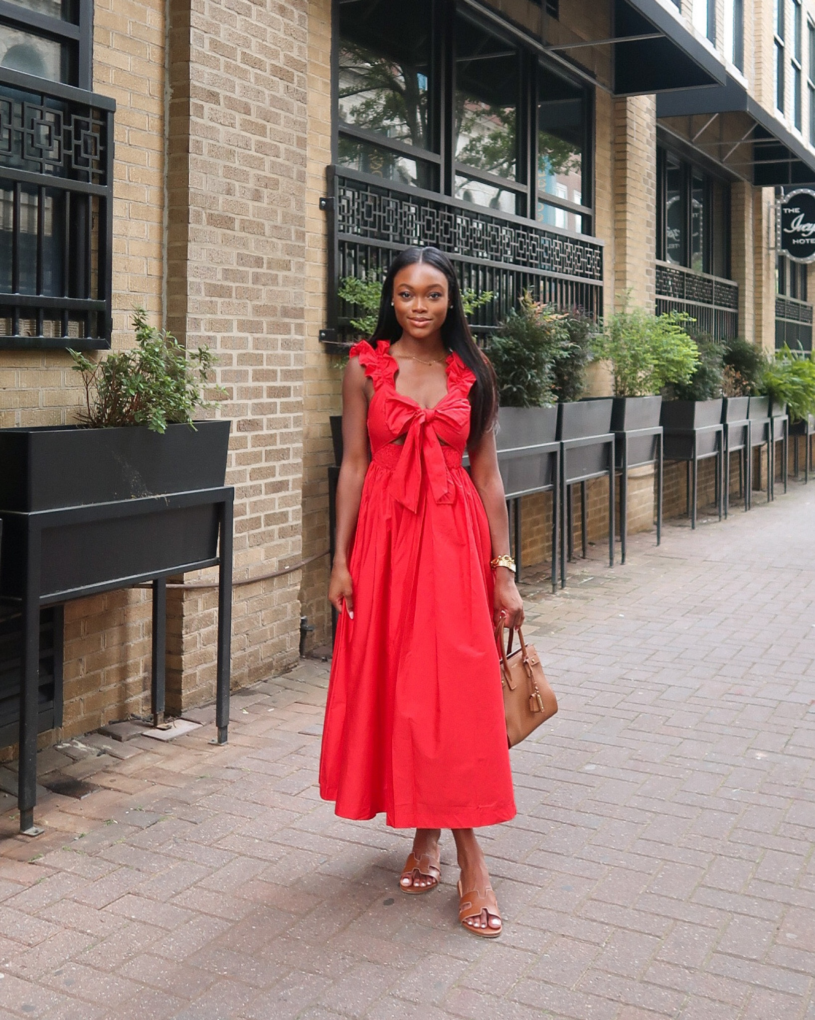 This red dress is fantastic because its vibrant hue and ruffled details create an eye-catching and elegant look. The flowy silhouette adds a touch of effortless chic, perfect for a standout summer ensemble.