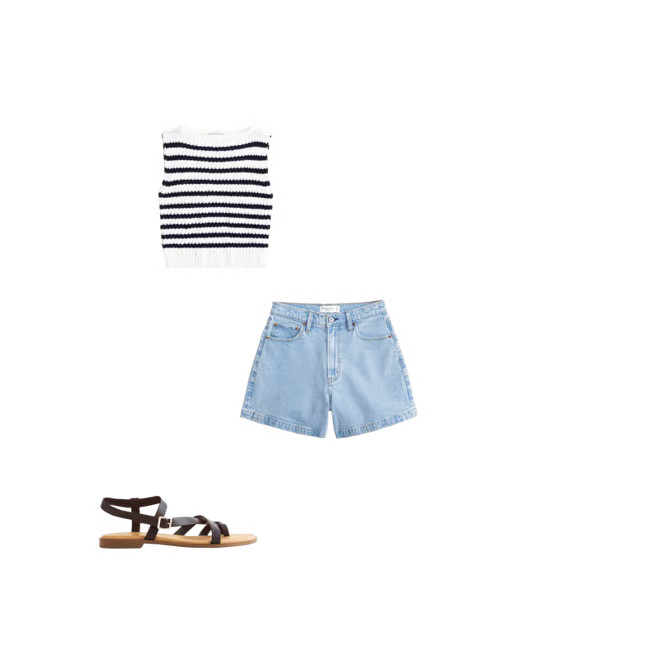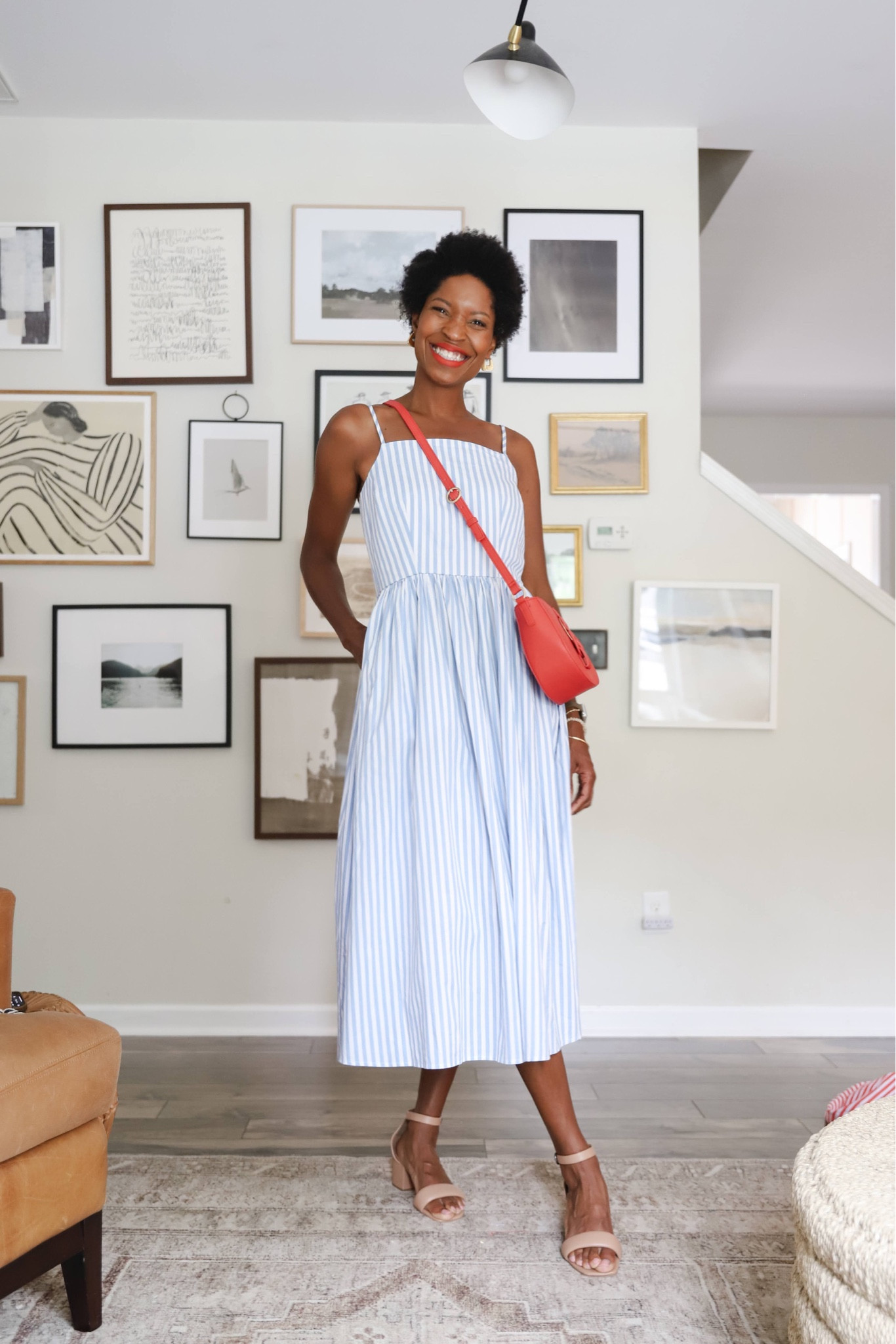 I love the classic vibe of the blue striped dress paired with the pop of red from the crossbody bag—it’s both fresh and effortlessly chic. The addition of neutral wedge sandals perfectly complements the look, making it ideal for a sunny day out.