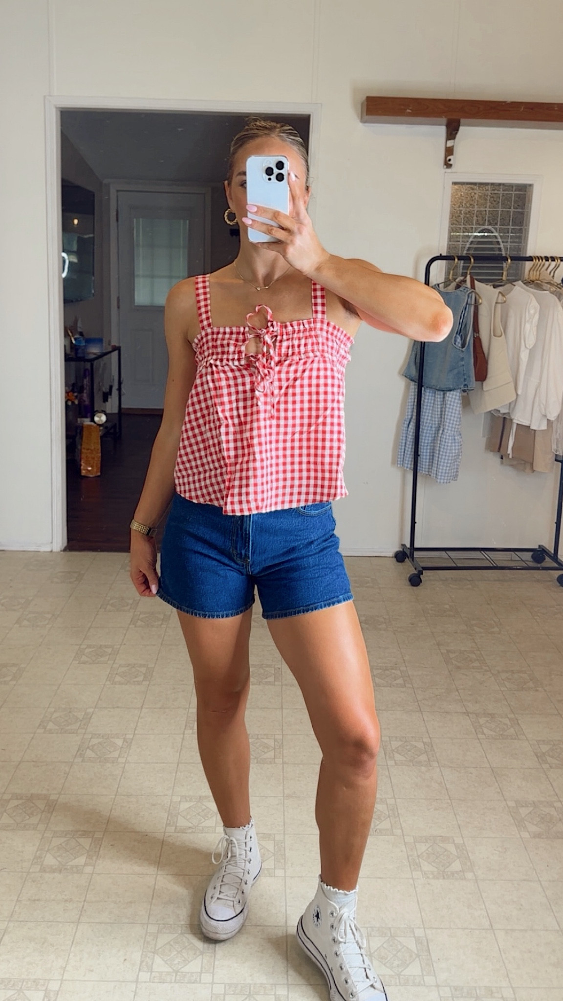 I love how the gingham pattern of the top adds a playful, timeless vibe to the ensemble. Paired with classic high-waisted shorts and white sneakers, it creates a fresh, casual look that’s perfect for summer outings.
