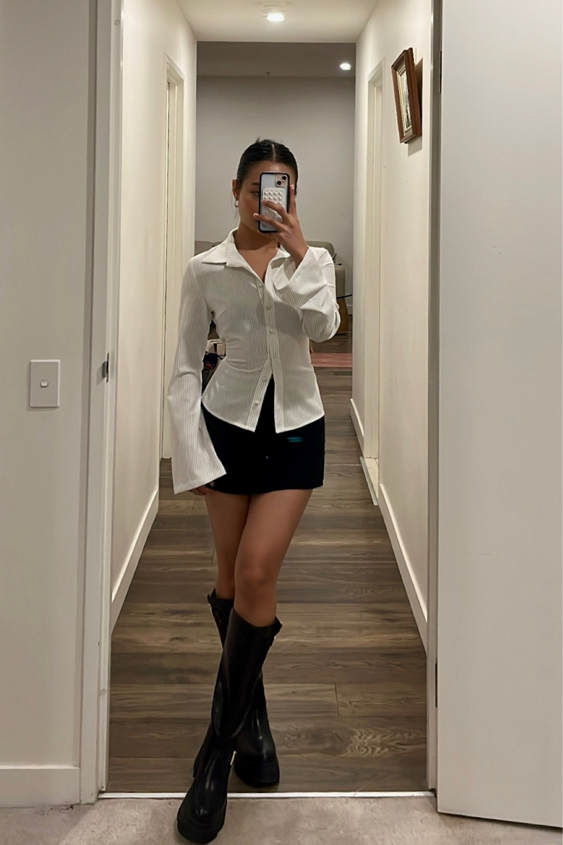 I love how this outfit combines a crisp, fitted white blouse with edgy black boots, creating a sharp yet stylish contrast. The mini skirt and heeled boots add a touch of elegance while maintaining a chic, modern vibe.