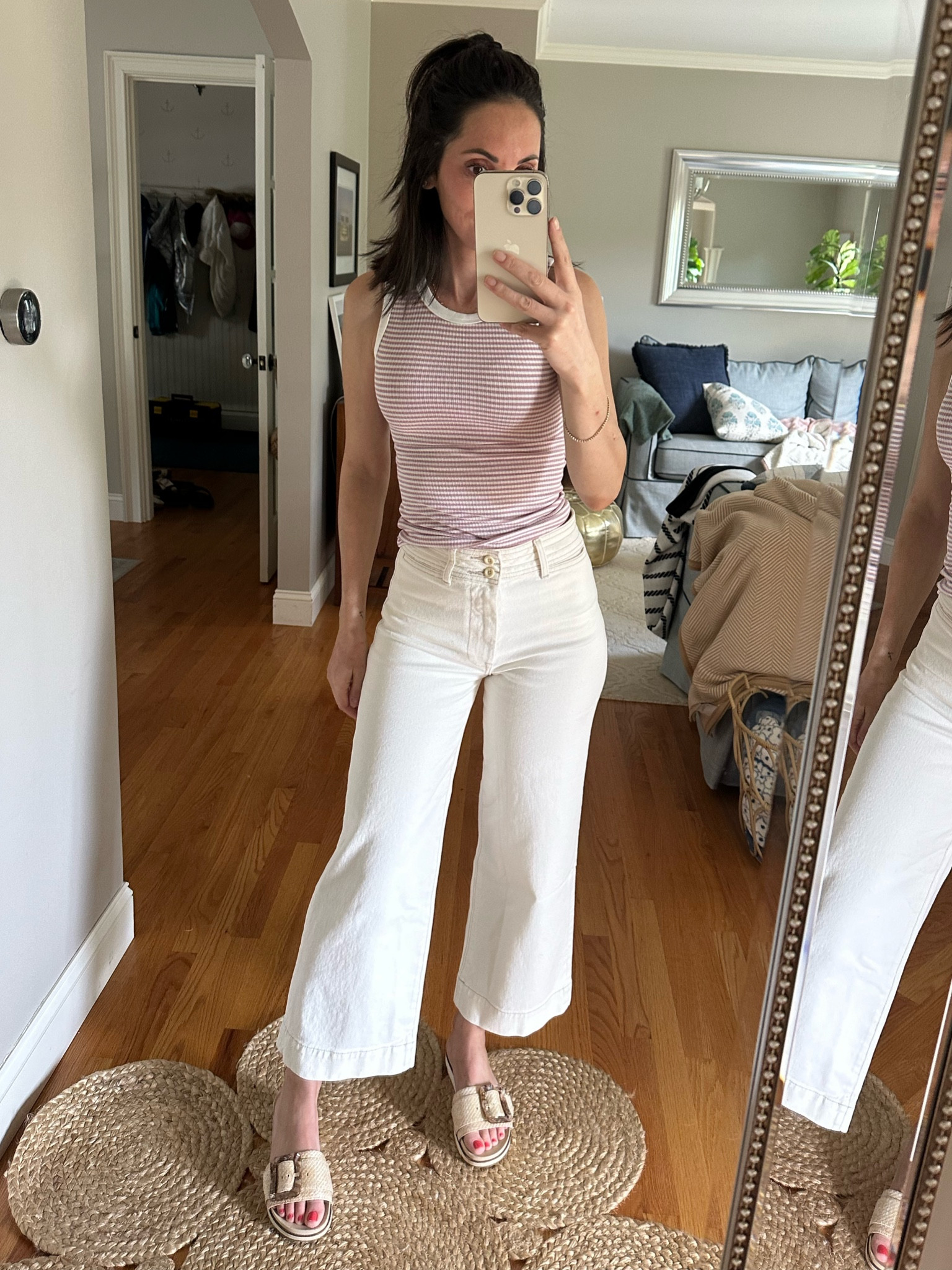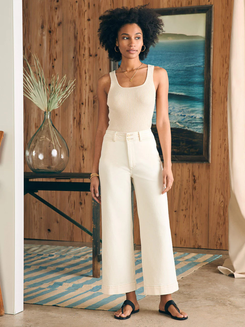 I love how the high-waisted, wide-legged white pants elongate the legs and provide a chic, summery feel. The sleeveless, striped top adds a casual, yet stylish touch that complements the laid-back vibe of the outfit.