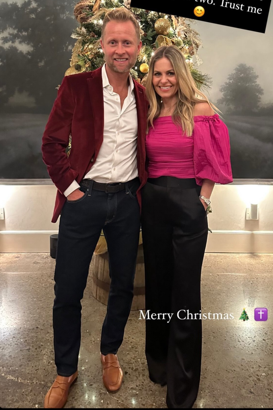 I love how the red velvet blazer adds a festive touch and sophistication, perfectly complementing the casual elegance of the dark jeans and loafers. The vibrant pink off-shoulder top and high-waisted black trousers create a chic and modern contrast, ideal for a stylish holiday celebration.