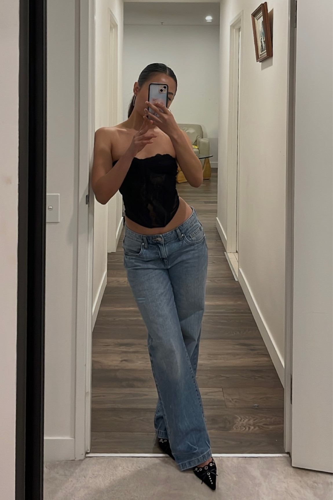I love how the stylish black corset top perfectly contrasts with the relaxed fit of the light-wash jeans, creating a chic yet laid-back look. The pointed black heels add a touch of sophistication, effortlessly elevating the entire outfit.