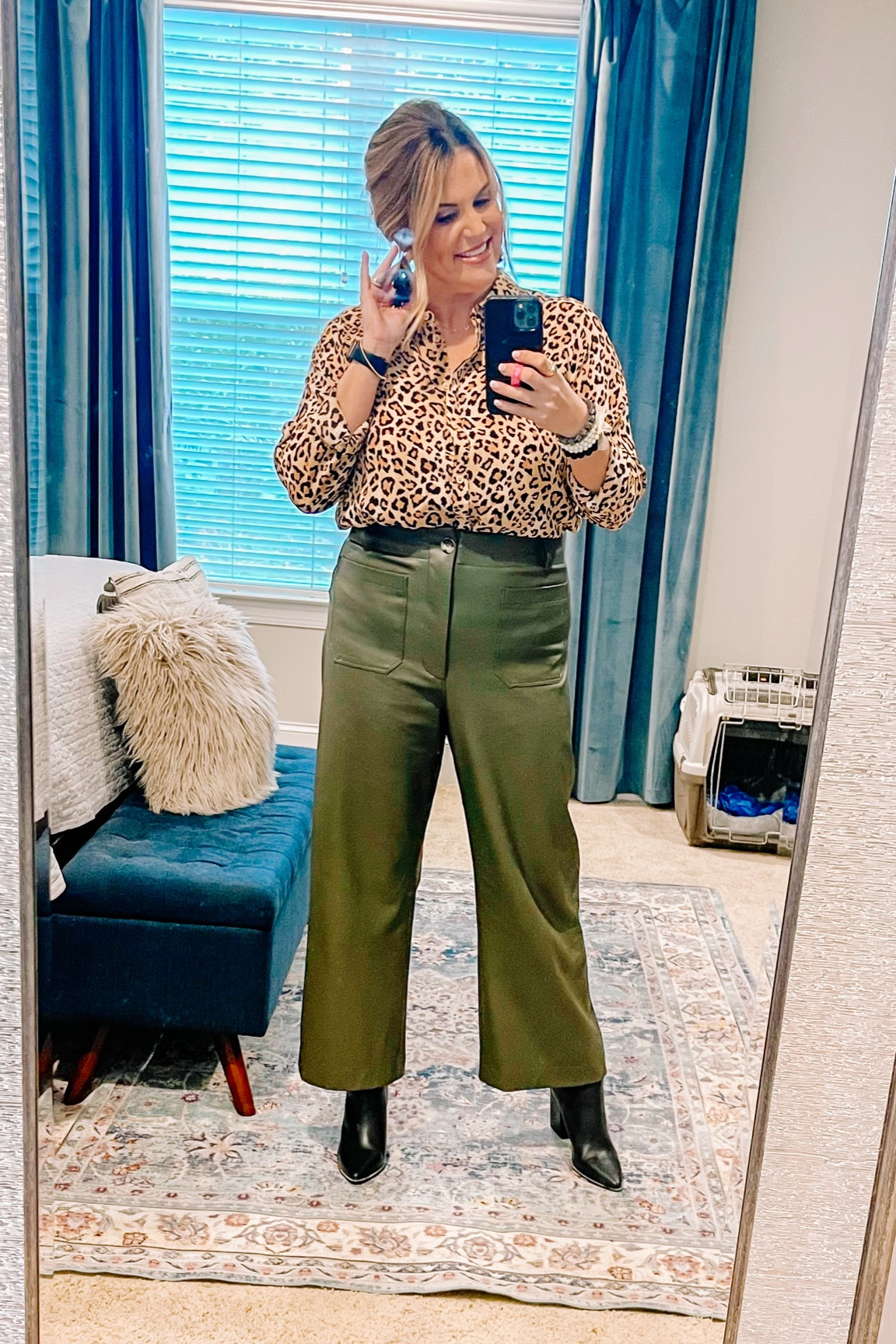 I love how the bold leopard print top adds a fun, fierce element, while the high-waisted olive green pants provide a chic, sophisticated balance. The black boots tie the look together effortlessly, making it stylish and cohesive.