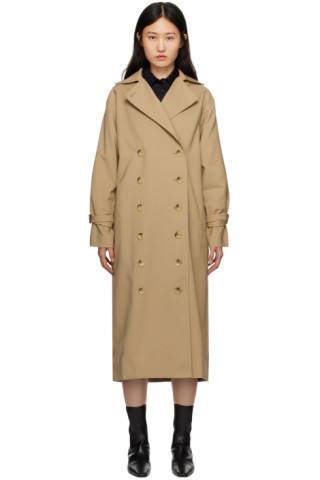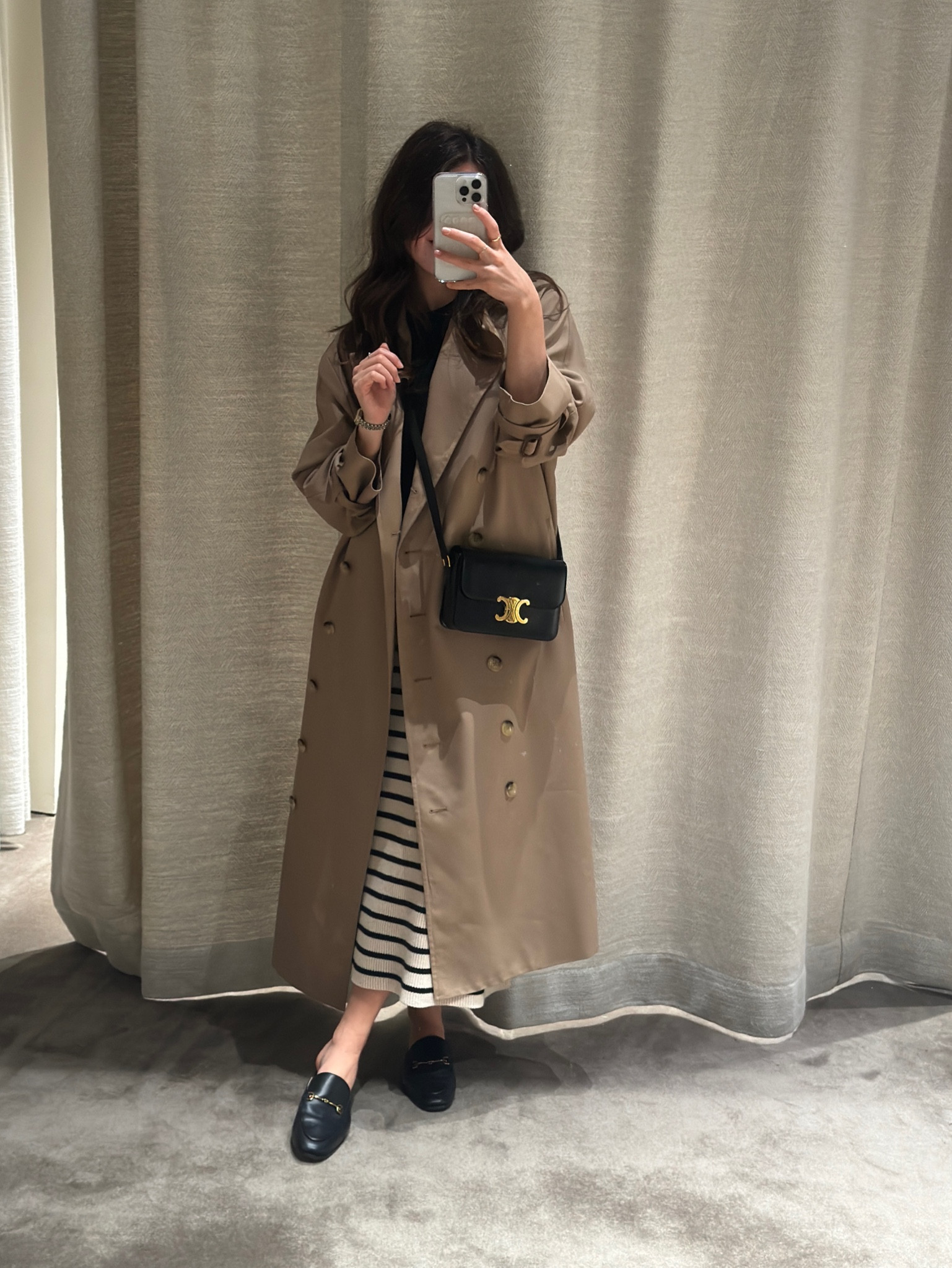 I love this outfit because the long beige trench coat adds a sophisticated, timeless appeal, while the striped dress underneath provides a chic, casual contrast. The black loafers and matching crossbody bag seamlessly tie the look together with effortless elegance.