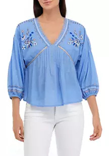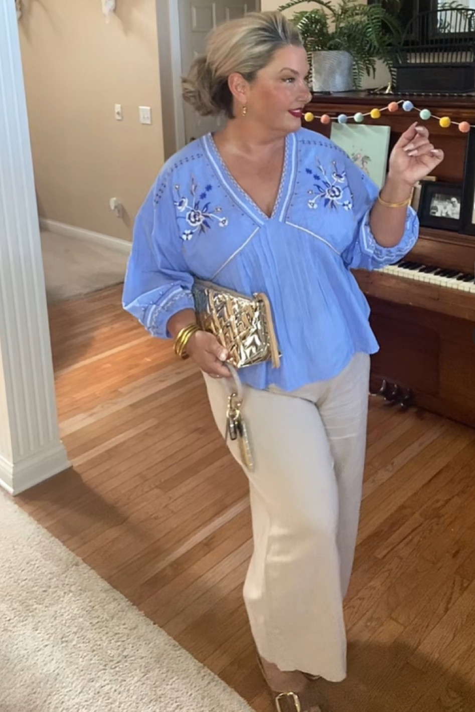 I love the combination of the light blue embroidered top with the ivory wide-leg pants, creating a chic and effortless look. The gold accessories and clutch add a touch of elegance and sophistication, perfect for any stylish occasion.
