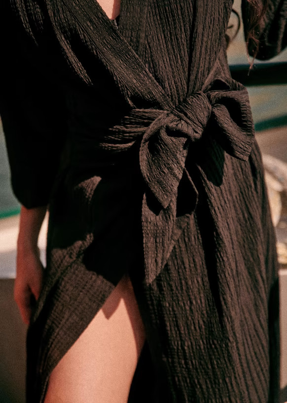 I love how the wrap dress elegantly accentuates the waist with its cinched tie, creating a flattering silhouette. The long sleeves add a touch of sophistication, making it versatile for both day and night.