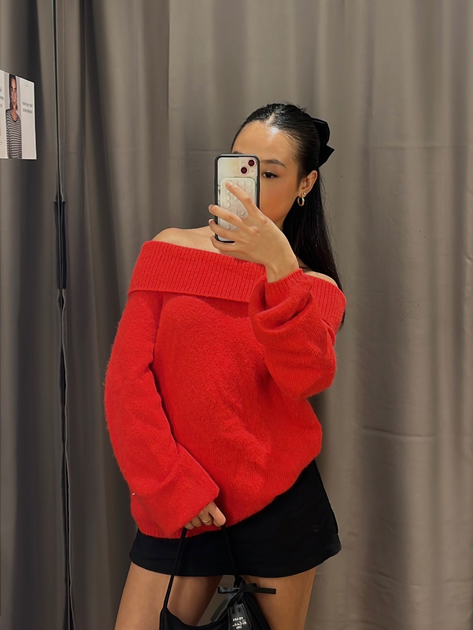I love how the vibrant red off-shoulder sweater adds a pop of color and effortlessly contrasts with the chic black skirt. The overall look is stylish and perfectly balanced for a casual yet fashionable appearance.