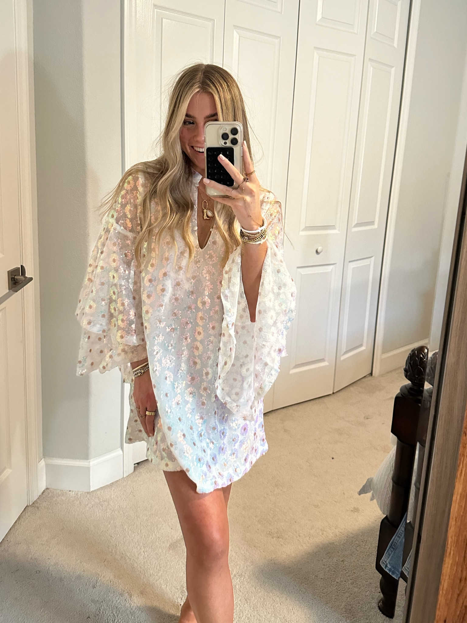 I love how the light, airy fabric of this dress effortlessly drapes, giving it a chic and breezy vibe. The subtle, iridescent floral detailing adds a playful yet sophisticated touch that’s perfect for any casual occasion.