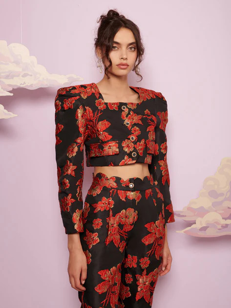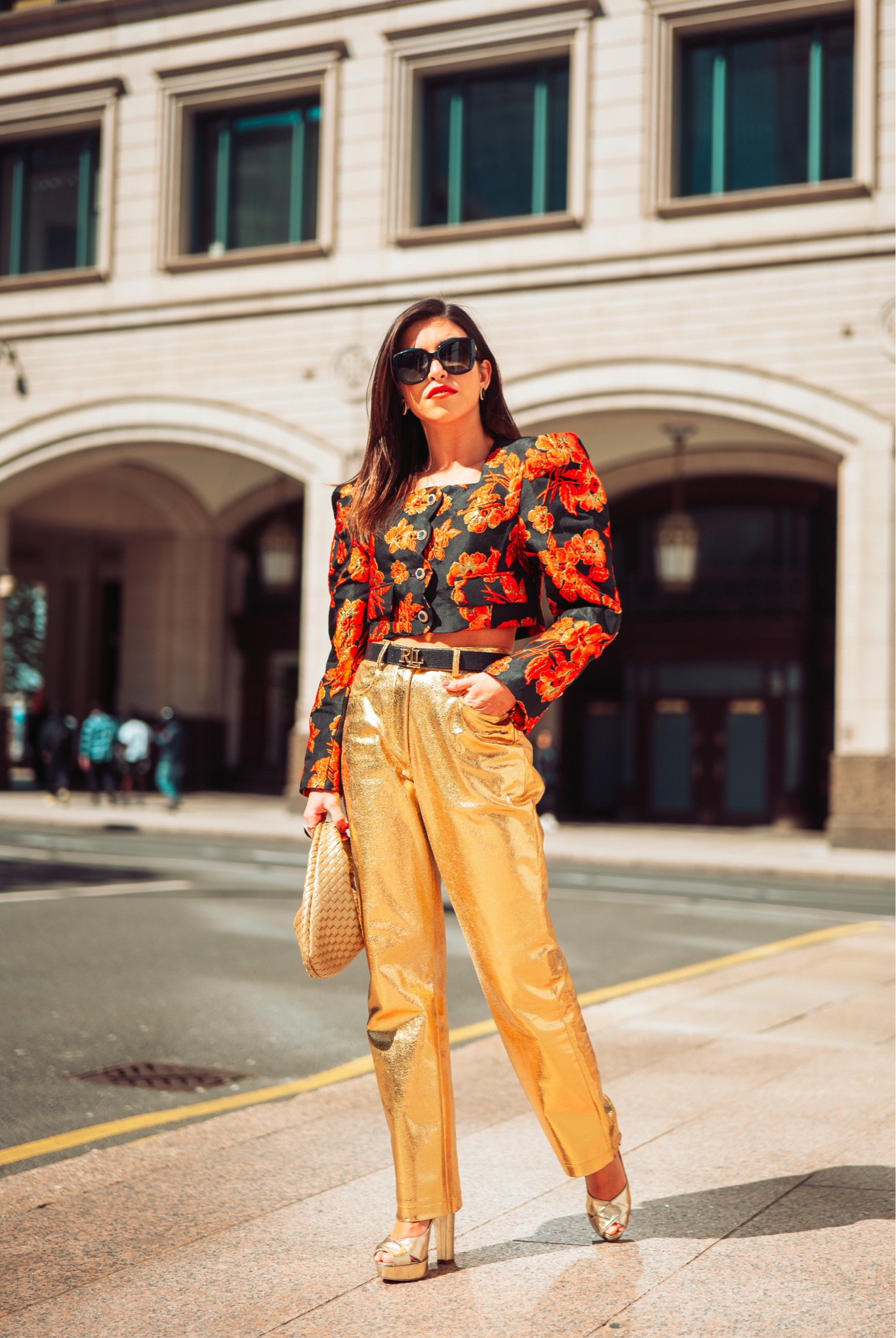 I love how this outfit combines bold patterns and metallic elements, creating a striking and glamorous look. The structured floral top paired with high-shine gold trousers and accessories strikes a perfect balance between elegance and daring fashion.